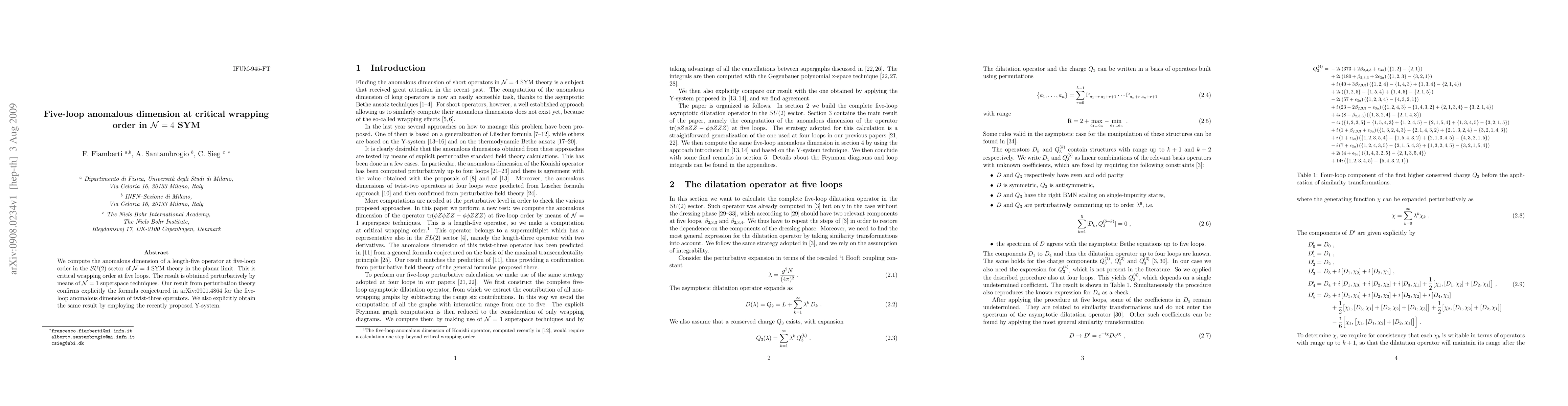 This paper computes the five-loop anomalous dimension of a length-five operator in the SU(2) sector of N=4 SYM theory at critical wrapping order, confirming a conjectured formula using N=1 superspace techniques and the Y-system. The result aligns with previous perturbation theory predictions.