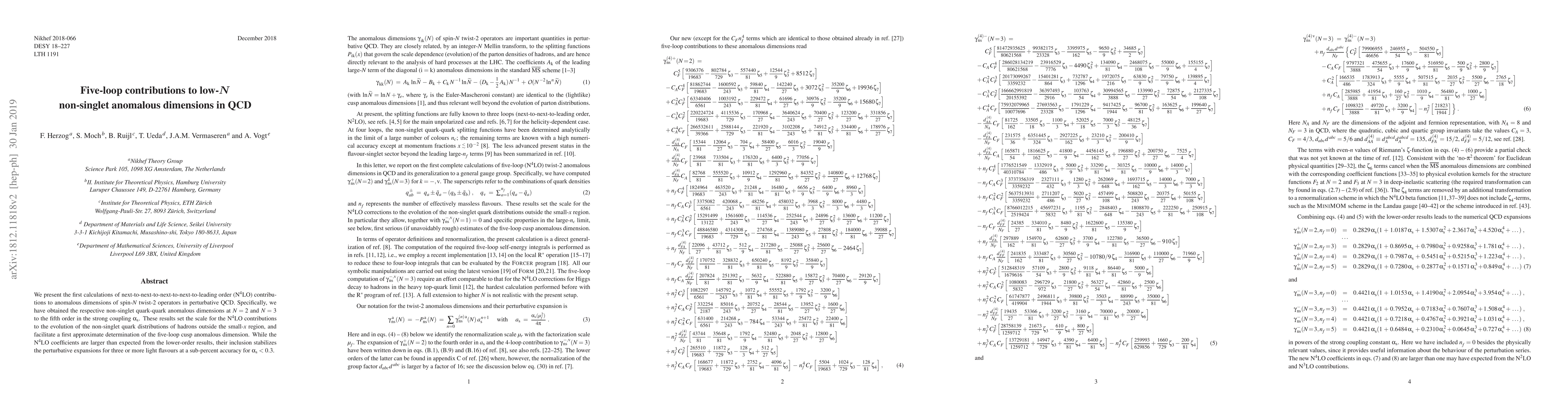 We present the first calculations of next-to-next-to-next-to-next-to-leading order (N^4LO) contributions to anomalous dimensions of spin-N twist-2 operators in perturbative QCD. Specifically, we have obtained the respective non-singlet quark-quark anomalous dimensions at N=2 and N=3 to the fifth order in the strong coupling alpha_s. These results set the scale for the N^4LO contributions to the evolution of the non-singlet quark distributions of hadrons outside the small-x region, and facilitate a first approximate determination of the five-loop cusp anomalous dimension. While the N^4LO coefficients are larger than expected from the lower-order results, their inclusion stabilizes the perturbative expansions for three or more light flavours at a sub-percent accuracy for alpha_s < 0.3.