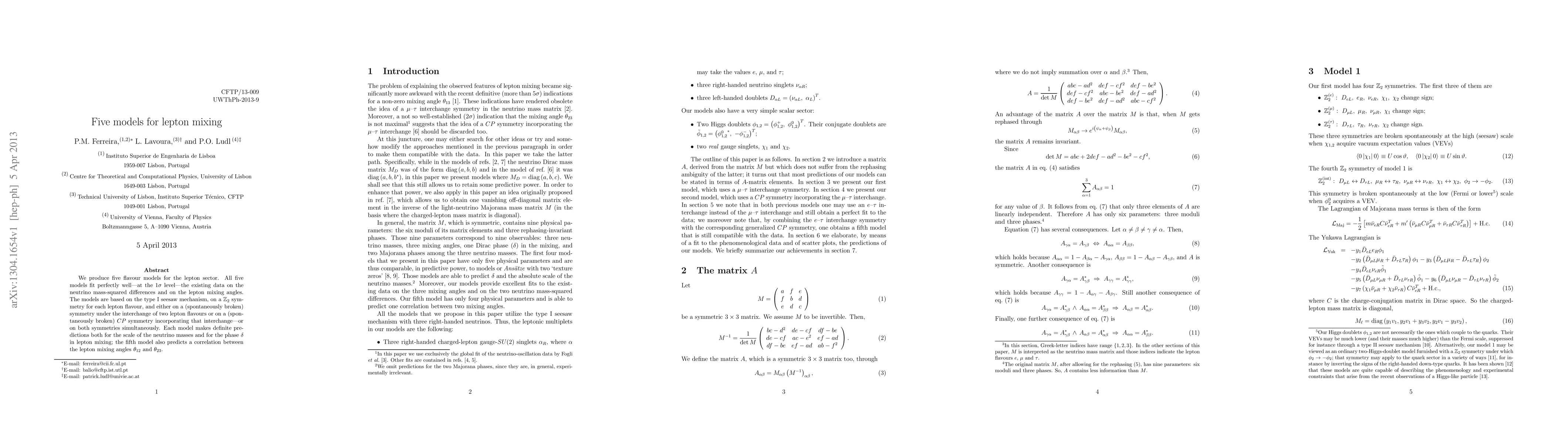 We produce five flavour models for the lepton sector. All five models fit perfectly well---at the one-sigma level---the existing data on the neutrino mass-squared differences and on the lepton mixing angles. The models are based on the type-I seesaw mechanism, on a Z_2 symmetry for each lepton flavour, and either on a (spontaneously broken) symmetry under the interchange of two lepton flavours or on a (spontaneously broken) CP symmetry incorporating that interchange---or on both symmetries simultaneously. Each model makes definite predictions both for the scale of the neutrino masses and for the phase delta in lepton mixing; the fifth model also predicts a correlation between the lepton mixing angles theta_12 and theta_23.