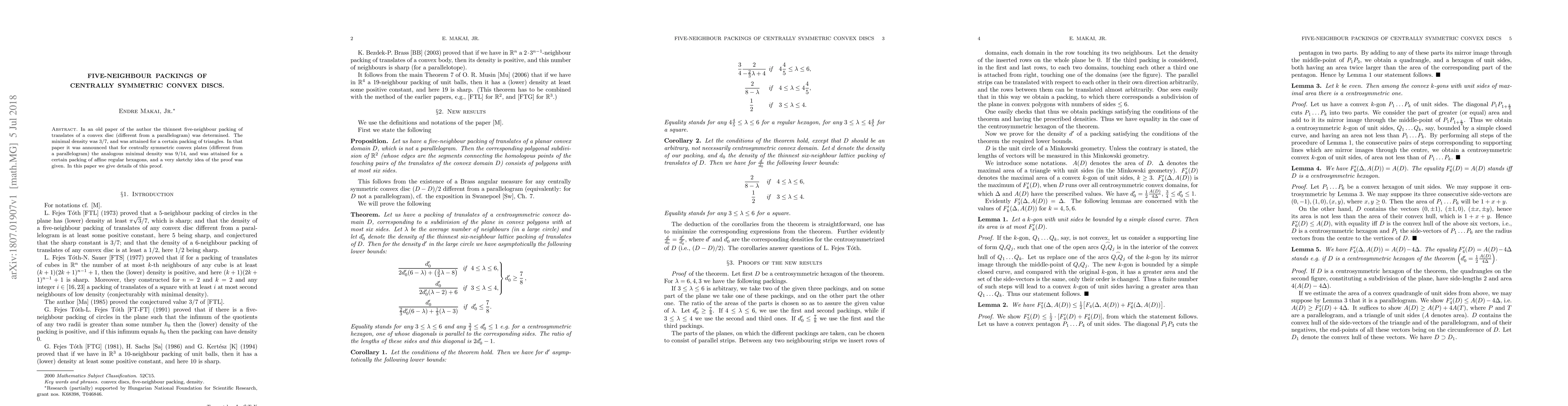 In an old paper of the author the thinnest five-neighbour packing of translates of a convex disc (different from a parallelogram) was determined. The minimal density was $3/7$, and was attained for a certain packing of triangles. In that paper it was announced that for centrally symmetric convex plates (different from a parallelogram) the analogous minimal density was $9/14$, and was attained for a certain packing of affine regular hexagons, and a very sketchy idea of the proof was given. In this paper we give details of this proof.