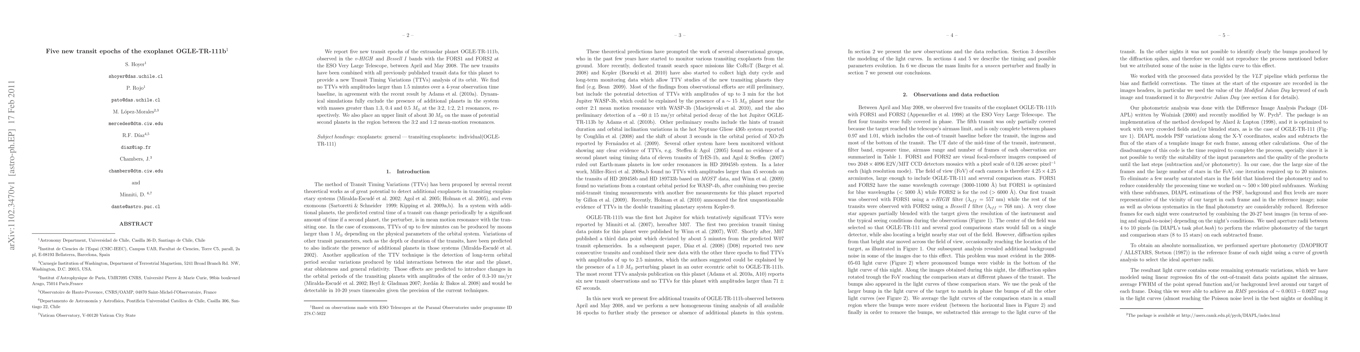 We report five new transit epochs of the extrasolar planet OGLE-TR-111b, observed in the v-HIGH and Bessell I bands with the FORS1 and FORS2 at the ESO Very Large Telescope, between April and May 2008. The new transits have been combined with all previously published transit data for this planet to provide a new Transit Timing Variations (TTVs) analysis of its orbit. We discard TTVs with amplitudes larger than 1.5 minutes over a 4-year observation time baseline, in agreement with the recent result by Adams et al.(2010a). Dynamical simulations fully exclude the presence of additional planets in the system with masses greater than 1.3, 0.4 and 0.5 M_earth at the 3:2, 1:2, 2:1 resonances, respectively. We also place an upper limit of about 30 M_earth on the mass of potential second planets in the region between the 3:2 and 1:2 mean-motion resonances.
