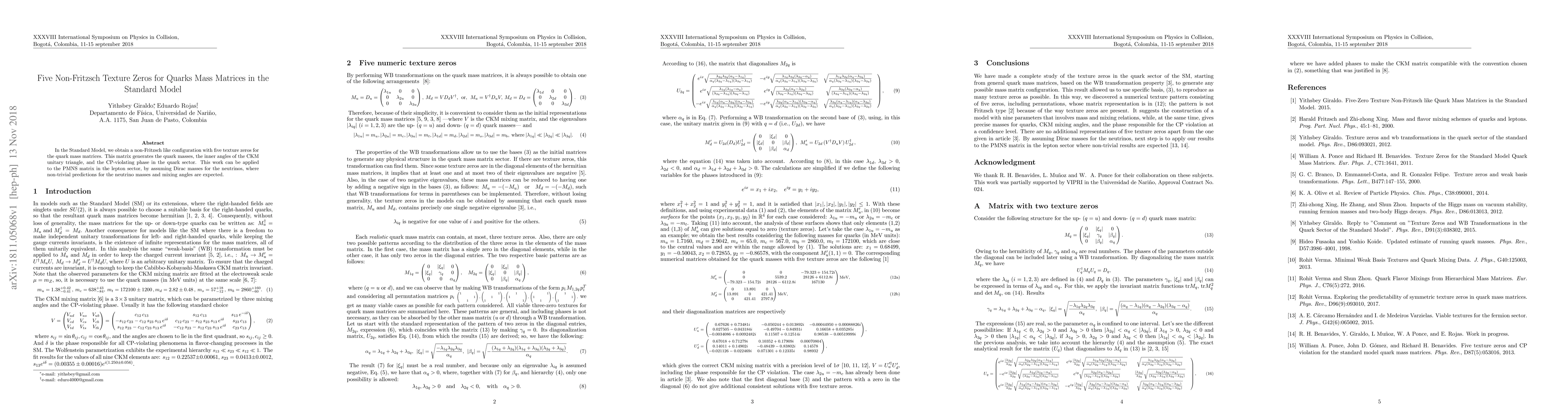 In the Standard Model, we obtain a non-Fritzsch like configuration with five texture zeros for the quark mass matrices. This matrix generates the quark masses, the inner angles of the CKM unitary triangle, and the CP-violating phase in the quark sector. This work can be applied to the PMNS matrix in the lepton sector, by assuming Dirac masses for the neutrinos, where non-trivial predictions for the neutrino masses and mixing angles are expected.
