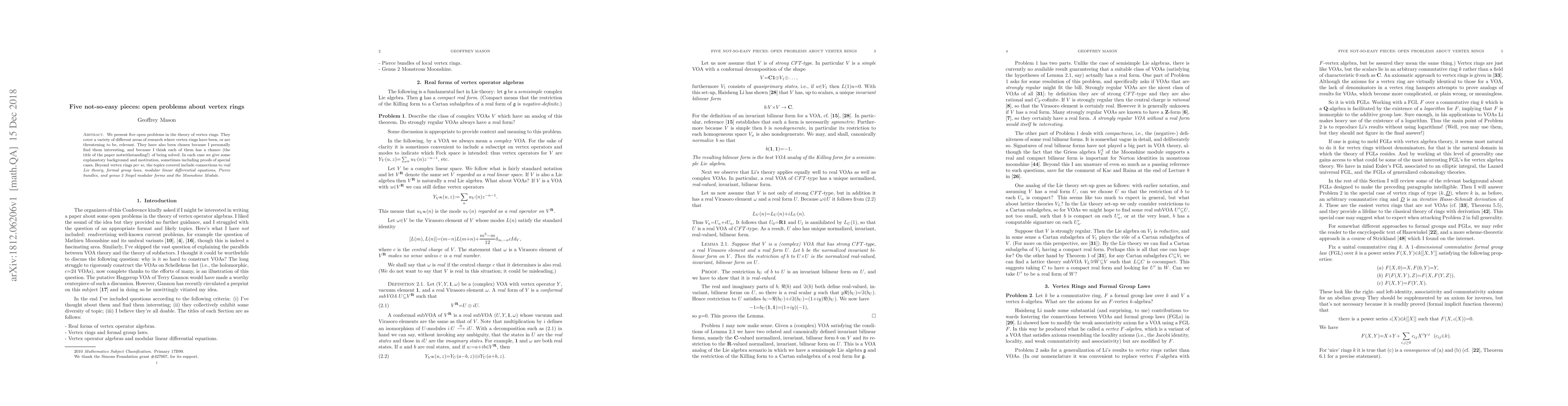 This paper outlines five intriguing open problems in the realm of vertex rings, highlighting their relevance across various research areas such as real Lie theory and modular forms. Each problem is accompanied by background information and partial solutions, reflecting the author's belief in their solvability.