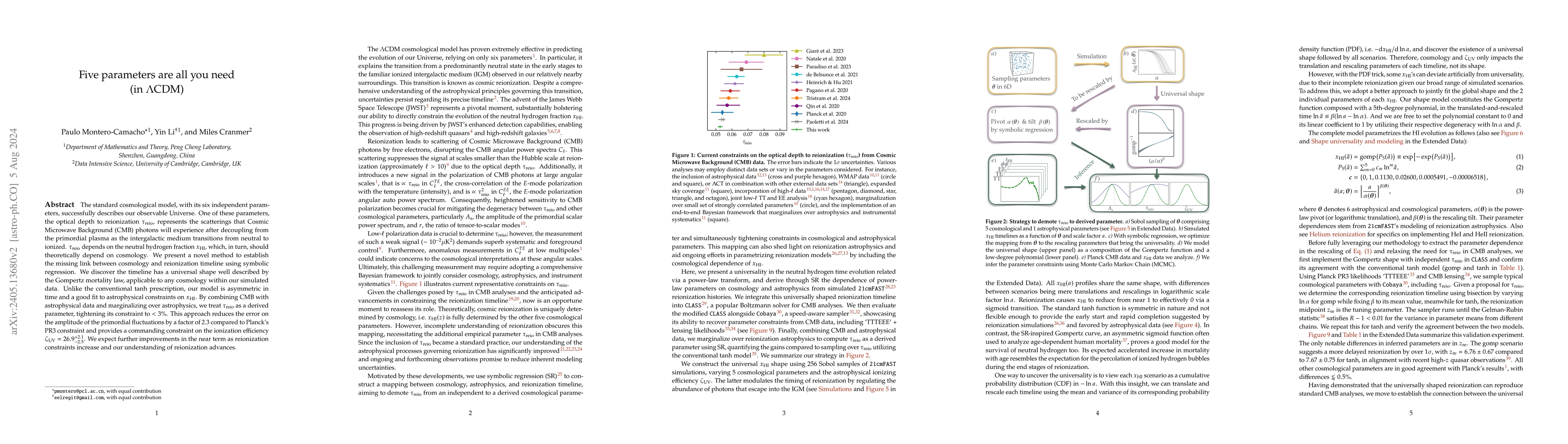 The paper proposes a novel method to reduce the standard cosmological model's parameters from six to five by establishing a universal shape for the reionization timeline, thus treating the optical depth to reionization as a derived parameter. This approach tightens constraints on $\tau_{\mathrm{reio}}$ and reduces errors on primordial fluctuations significantly.