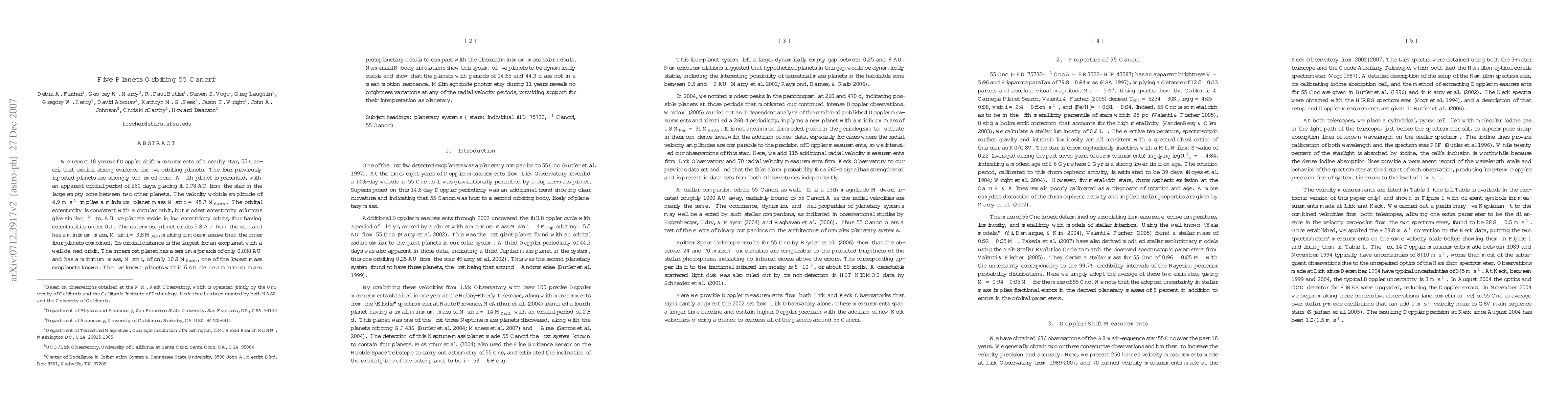 We report 18 years of Doppler shift measurements of a nearby star, 55 Cancri, that exhibit strong evidence for five orbiting planets. The four previously reported planets are strongly confirmed here. A fifth planet is presented, with an apparent orbital period of 260 days, placing it 0.78 AU from the star in the large empty zone between two other planets. The velocity wobble amplitude of 4.9 \ms implies a minimum planet mass \msini = 45.7 \mearthe. The orbital eccentricity is consistent with a circular orbit, but modest eccentricity solutions give similar \chisq fits. All five planets reside in low eccentricity orbits, four having eccentricities under 0.1. The outermost planet orbits 5.8 AU from the star and has a minimum mass, \msini = 3.8 \mjupe, making it more massive than the inner four planets combined. Its orbital distance is the largest for an exoplanet with a well defined orbit. The innermost planet has a semi-major axis of only 0.038 AU and has a minimum mass, \msinie, of only 10.8 \mearthe, one of the lowest mass exoplanets known. The five known planets within 6 AU define a {\em minimum mass protoplanetary nebula} to compare with the classical minimum mass solar nebula. Numerical N-body simulations show this system of five planets to be dynamically stable and show that the planets with periods of 14.65 and 44.3 d are not in a mean-motion resonance. Millimagnitude photometry during 11 years reveals no brightness variations at any of the radial velocity periods, providing support for their interpretation as planetary.