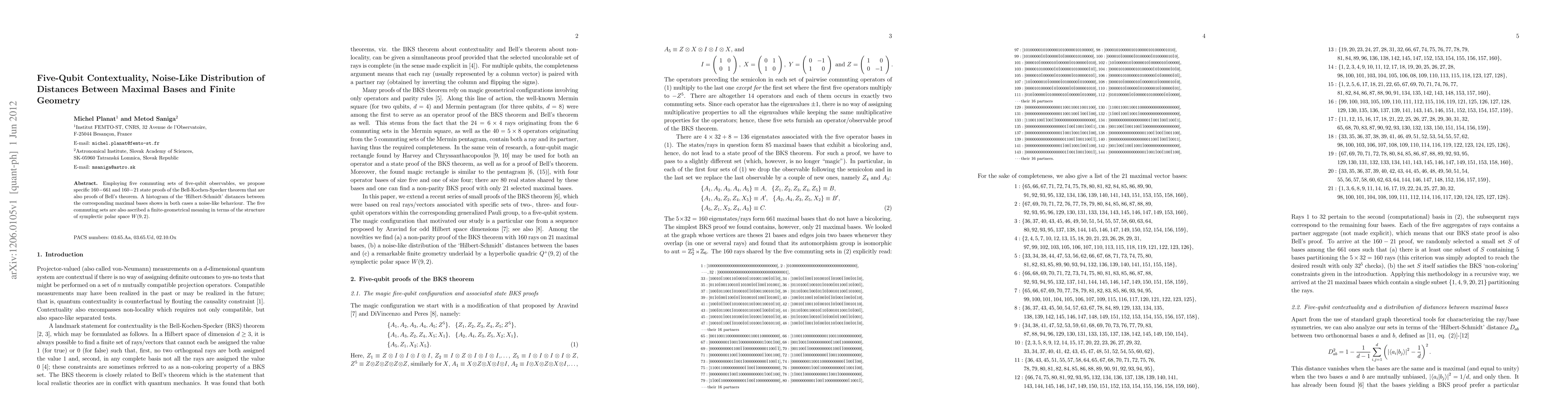 Employing five commuting sets of five-qubit observables, we propose specific 160-661 and 160-21 state proofs of the Bell-Kochen-Specker theorem that are also proofs of Bell's theorem. A histogram of the 'Hilbert-Schmidt' distances between the corresponding maximal bases shows in both cases a noise-like behaviour. The five commuting sets are also ascribed a finite-geometrical meaning in terms of the structure of symplectic polar space W(9,2).