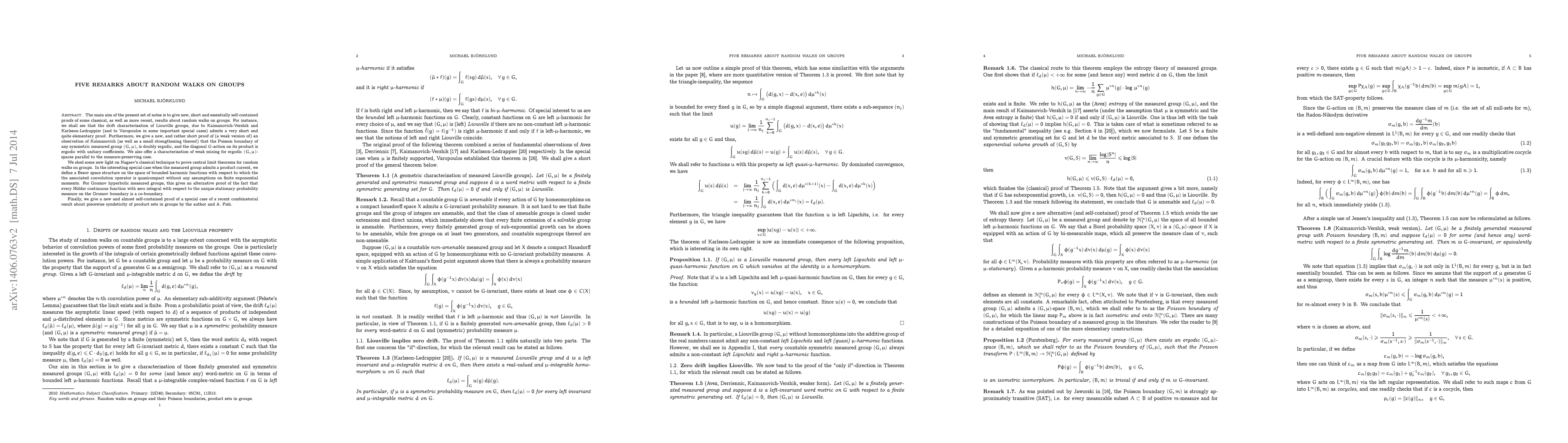 The main aim of the present set of notes is to give new, short and essentially self-contained proofs of some classical, as well as more recent, results about random walks on groups. For instance, we shall see that the drift characterization of Liouville groups, due to Kaimanovich-Vershik and Karlsson-Ledrappier (and to Varopoulos in some important special cases) admits a very short and quite elementary proof. Furthermore, we give a new, and rather short proof of (a weak version of) an observation of Kaimanovich (as well as a small strengthening thereof) that the Poisson boundary of any symmetric measured group $(G,\mu)$, is doubly ergodic, and the diagonal $G$-action on its product is ergodic with unitary coefficients. We also offer a characterization of weak mixing for ergodic $(G,\mu)$-spaces parallel to the measure-preserving case. We shed some new light on Nagaev's classical technique to prove central limit theorems for random walks on groups. In the interesting special case when the measured group admits a product current, we define a Besov space structure on the space of bounded harmonic functions with respect to which the the associated convolution operator is quasicompact without any assumptions on finite exponential moments. For Gromov hyperbolic measured groups, this gives an alternative proof of the fact that every H\"older continuous function with zero integral with respect to the unique stationary probability measure on the Gromov boundary is a co-boundary. Finally, we give a new and almost self-contained proof of a special case of a recent combinatorial result about piecewise syndeticity of product sets in groups by the author and A. Fish.