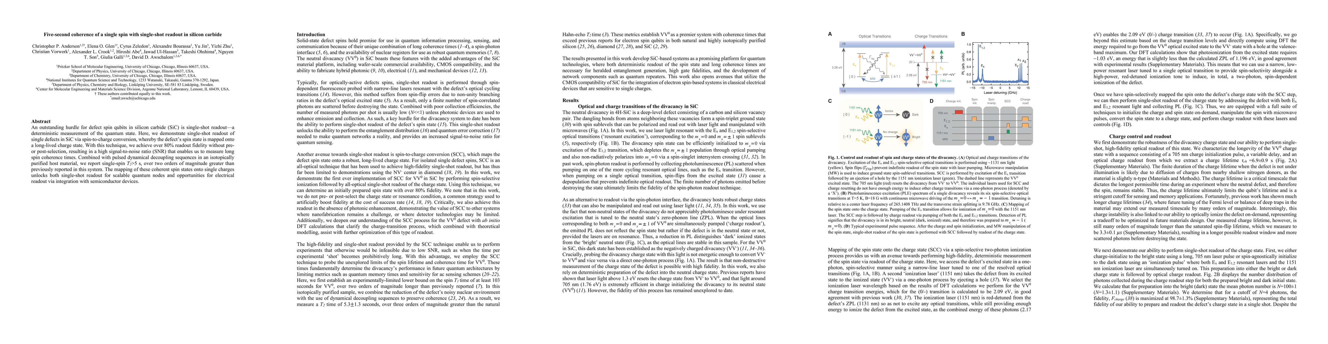 This paper demonstrates single-shot readout of silicon carbide defect spin qubits through spin-to-charge conversion, achieving over 80% fidelity and a T2 coherence time of over 5 seconds, significantly improving previous records and enabling scalable quantum computing.