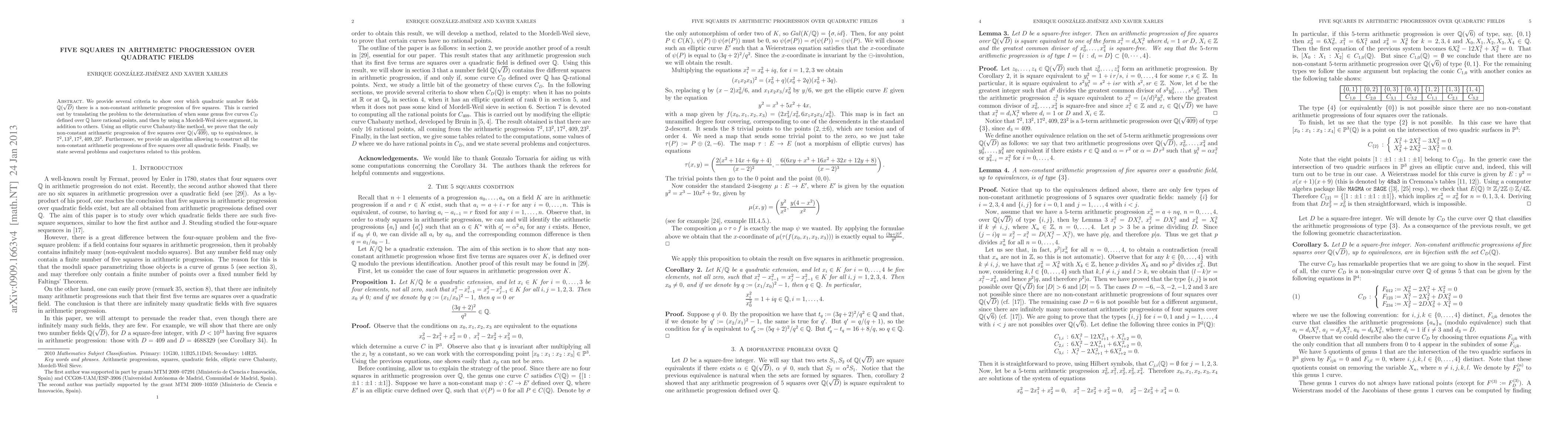 We give several criteria to show over which quadratic number fields Q(sqrt{D}) there should exists a non-constant arithmetic progressions of five squares. This is done by translating the problem to determining when some genus five curves C_D defined over Q have rational points, and then using a Mordell-Weil sieve argument among others. Using a elliptic Chabauty-like method, we prove that the only non-constant arithmetic progressions of five squares over Q(sqrt{409}), up to equivalence, is 7^2, 13^2, 17^2, 409, 23^2. Furthermore, we give an algorithm that allow to construct all the non-constant arithmetic progressions of five squares over all quadratic fields. Finally, we state several problems and conjectures related to this problem.