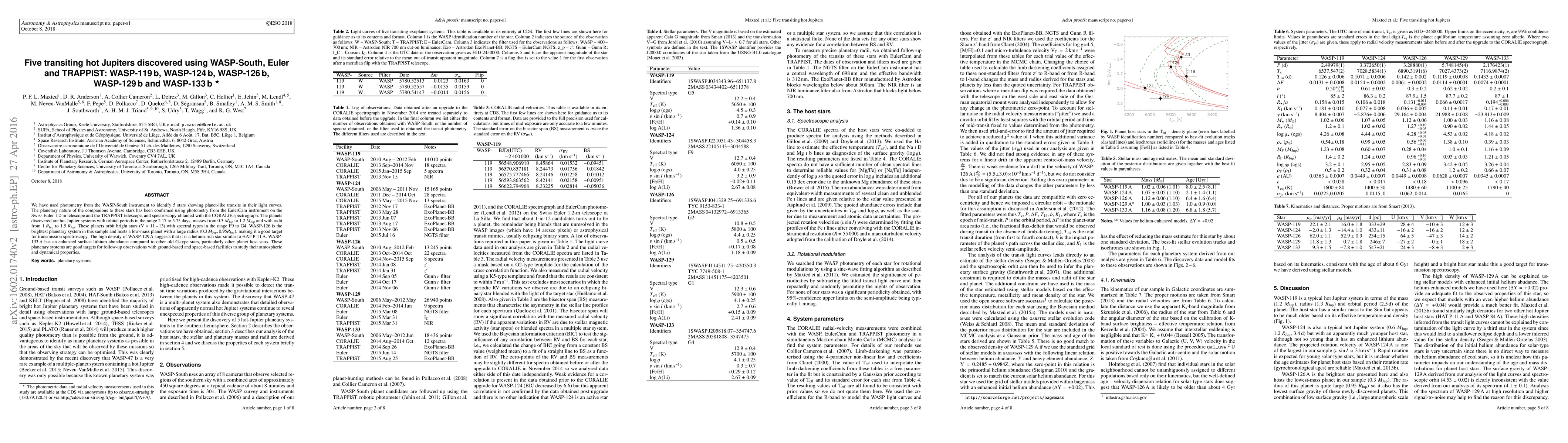 This paper reports the discovery of five hot Jupiters—WASP-119 b, WASP-124 b, WASP-126 b, WASP-129 b, and WASP-133 b—using WASP-South, EulerCam, and TRAPPIST telescopes. These planets exhibit diverse characteristics, including orbital periods from 2.17 to 5.75 days, making them ideal targets for further atmospheric and dynamical studies.