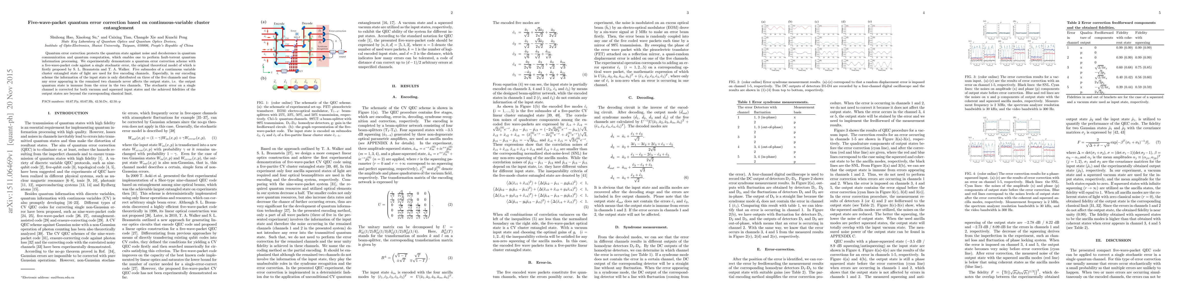 This paper presents an experimental quantum error correction scheme using a five-wave-packet code based on continuous-variable cluster entanglement. The scheme corrects single stochastic errors in vacuum and squeezed input states, achieving fidelities surpassing classical limits, demonstrating immunity to errors in two out of five channels.