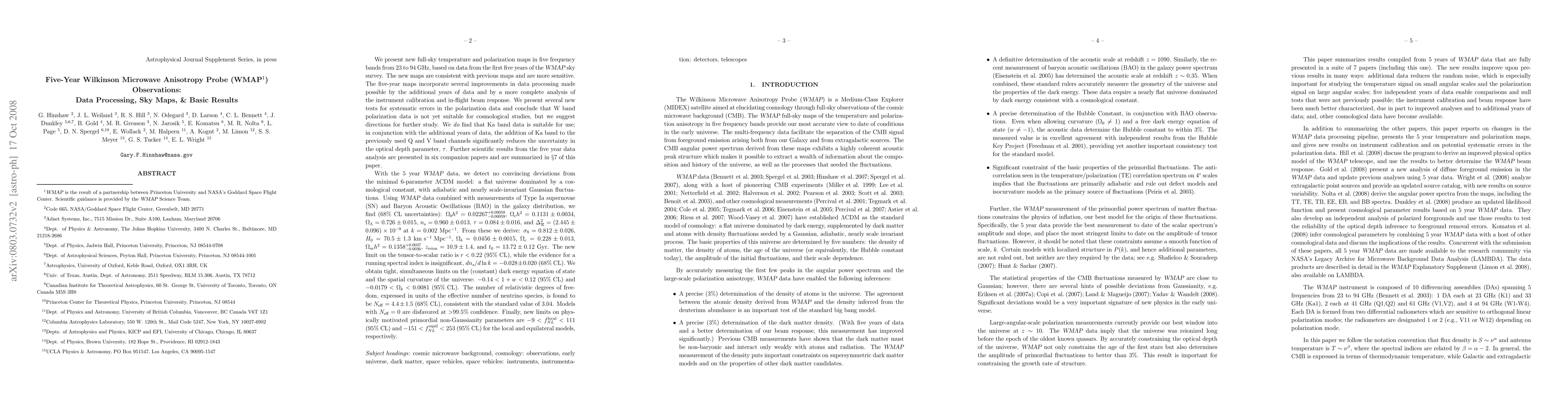 We present new full-sky temperature and polarization maps in five frequency bands from 23 to 94 GHz, based on data from the first five years of the WMAP sky survey. The five-year maps incorporate several improvements in data processing made possible by the additional years of data and by a more complete analysis of the instrument calibration and in-flight beam response. We present several new tests for systematic errors in the polarization data and conclude that Ka band data (33 GHz) is suitable for use in cosmological analysis, after foreground cleaning. This significantly reduces the overall polarization uncertainty. With the 5 year WMAP data, we detect no convincing deviations from the minimal 6-parameter LCDM model: a flat universe dominated by a cosmological constant, with adiabatic and nearly scale-invariant Gaussian fluctuations. Using WMAP data combined with measurements of Type Ia supernovae and Baryon Acoustic Oscillations, we find (68% CL uncertainties): Omega_bh^2 = 0.02267 \pm 0.00059, Omega_ch^2 = 0.1131 \pm 0.0034, Omega_Lambda = 0.726 \pm 0.015, n_s = 0.960 \pm 0.013, tau = 0.084 \pm 0.016, and Delta_R^2 = (2.445 \pm 0.096) x 10^-9. From these we derive: sigma_8 = 0.812 \pm 0.026, H_0 = 70.5 \pm 1.3 km/s/Mpc, z_{reion} = 10.9 \pm 1.4, and t_0 = 13.72 \pm 0.12 Gyr. The new limit on the tensor-to-scalar ratio is r < 0.22 (95% CL). We obtain tight, simultaneous limits on the (constant) dark energy equation of state and spatial curvature: -0.14 < 1+w < 0.12 and -0.0179 < Omega_k < 0.0081 (both 95% CL). The number of relativistic degrees of freedom (e.g. neutrinos) is found to be N_{eff} = 4.4 \pm 1.5, consistent with the standard value of 3.04. Models with N_{eff} = 0 are disfavored at >99.5% confidence.