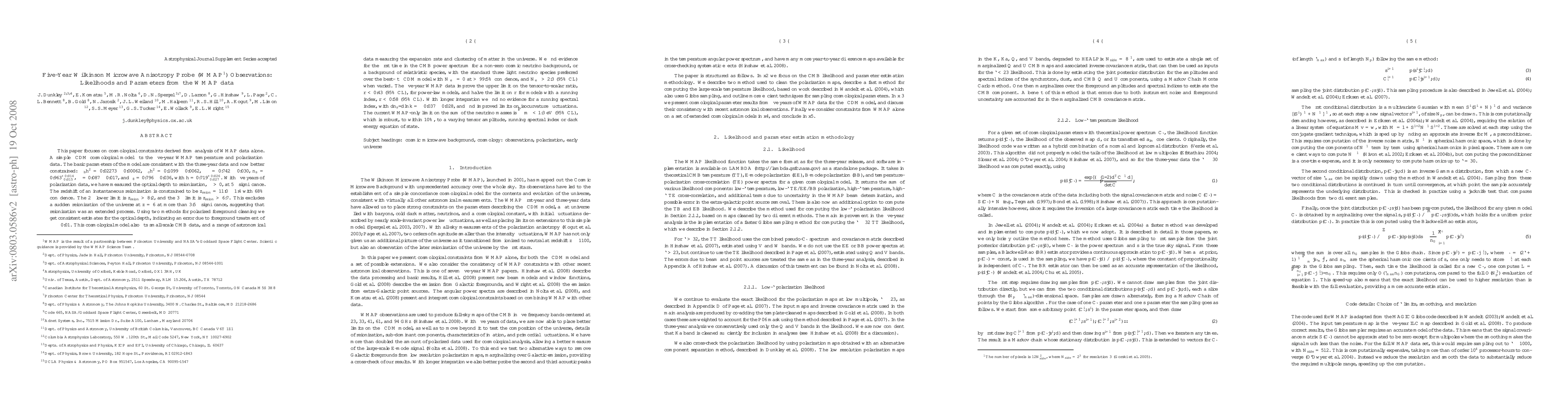 This paper analyzes five-year WMAP data to derive cosmological constraints within a simple LCDM model, finding more precise parameters and evidence for a non-zero cosmic neutrino background. It also confirms an extended reionization process and improves limits on the tensor-to-scalar ratio.