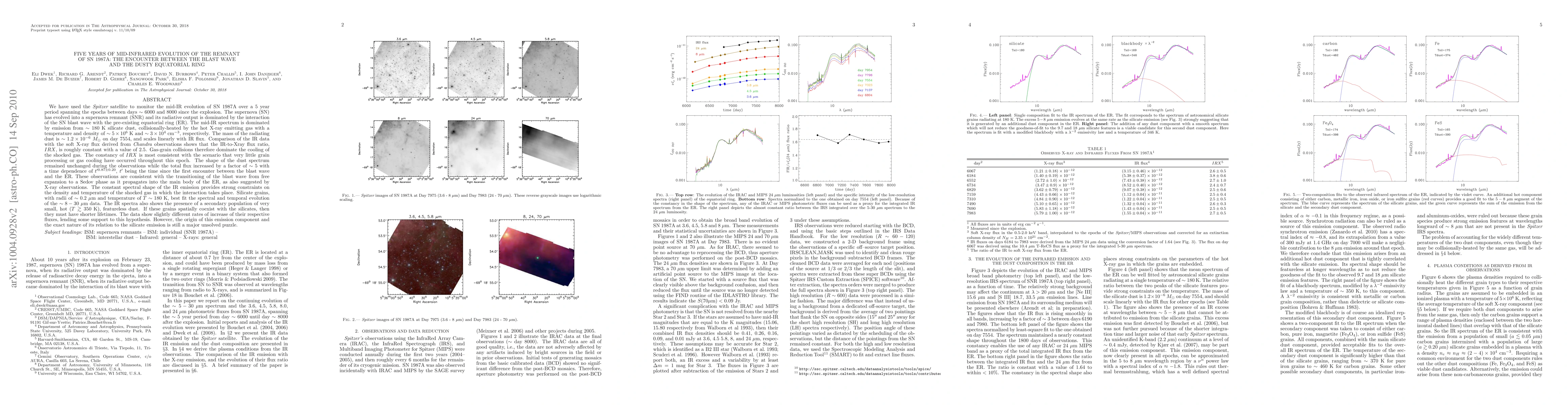 This study, using Spitzer satellite data over 5 years post-explosion, monitored SN 1987A's evolution into a remnant. Key findings include dominant mid-IR emission from silicate dust heated by hot X-ray gas, a constant infrared to soft-X-ray flux ratio suggesting minimal grain processing, and a dust mass of ~1.2x10^(-6) Msun. The dust spectrum's constancy and flux increase (t^0.87) imply transition from free expansion to Sedov phase as the blast wave interacts with the equatorial ring.