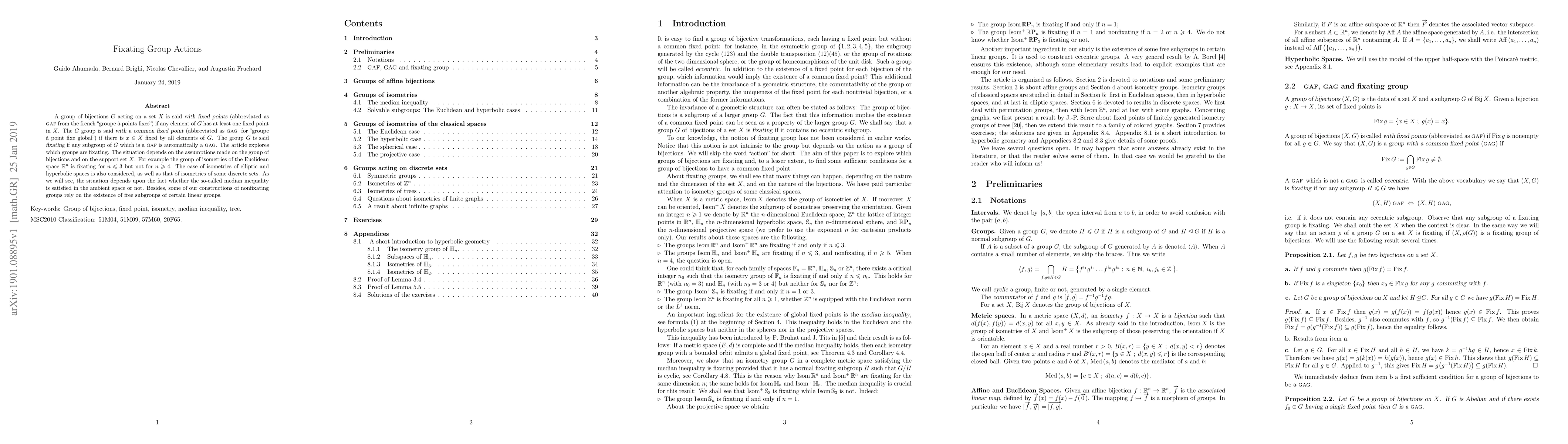 This paper investigates 'fixating groups', where any subgroup with fixed points also has a common fixed point. The fixating property varies based on the group of bijections and the set X under consideration. For instance, isometries in R^n are fixating for n ≥ 3, but not for n = 4. The study also covers elliptic and hyperbolic spaces, discrete sets, and linear groups, highlighting the role of the median inequality in these ambient spaces.