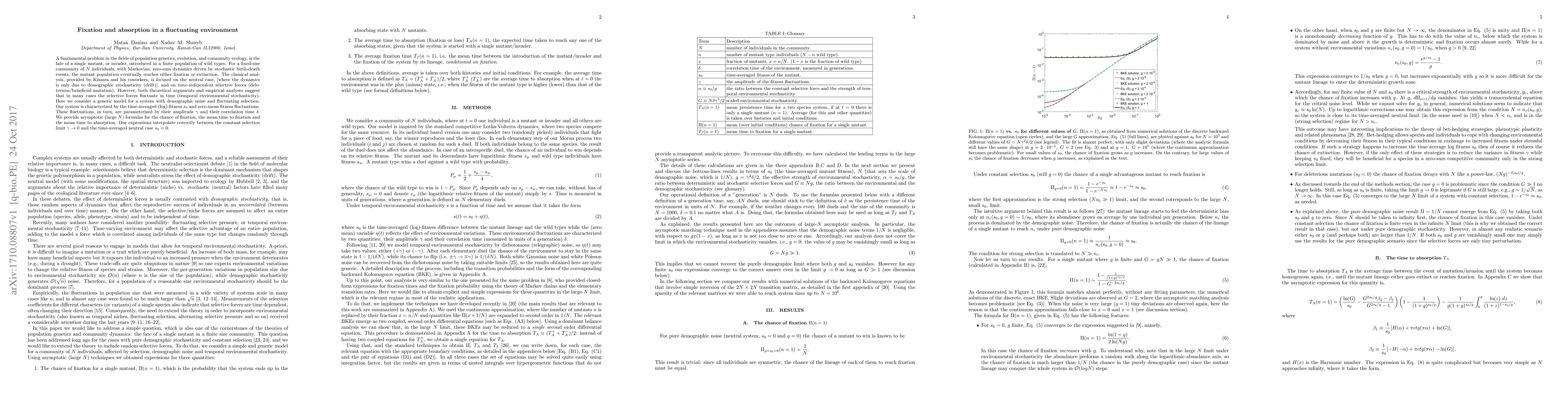 A fundamental problem in the fields of population genetics, evolution, and community ecology, is the fate of a single mutant, or invader, introduced in a finite population of wild types. For a fixed-size community of $N$ individuals, with Markovian, zero-sum dynamics driven by stochastic birth-death events, the mutant population eventually reaches either fixation or extinction. The classical analysis, provided by Kimura and his coworkers, is focused on the neutral case, [where the dynamics is only due to demographic stochasticity (drift)], and on \emph{time-independent} selective forces (deleterious/beneficial mutation). However, both theoretical arguments and empirical analyses suggest that in many cases the selective forces fluctuate in time (temporal environmental stochasticity). Here we consider a generic model for a system with demographic noise and fluctuating selection. Our system is characterized by the time-averaged (log)-fitness $s_0$ and zero-mean fitness fluctuations. These fluctuations, in turn, are parameterized by their amplitude $\gamma$ and their correlation time $\delta$. We provide asymptotic (large $N$) formulas for the chance of fixation, the mean time to fixation and the mean time to absorption. Our expressions interpolate correctly between the constant selection limit $\gamma \to 0$ and the time-averaged neutral case $s_0=0$.