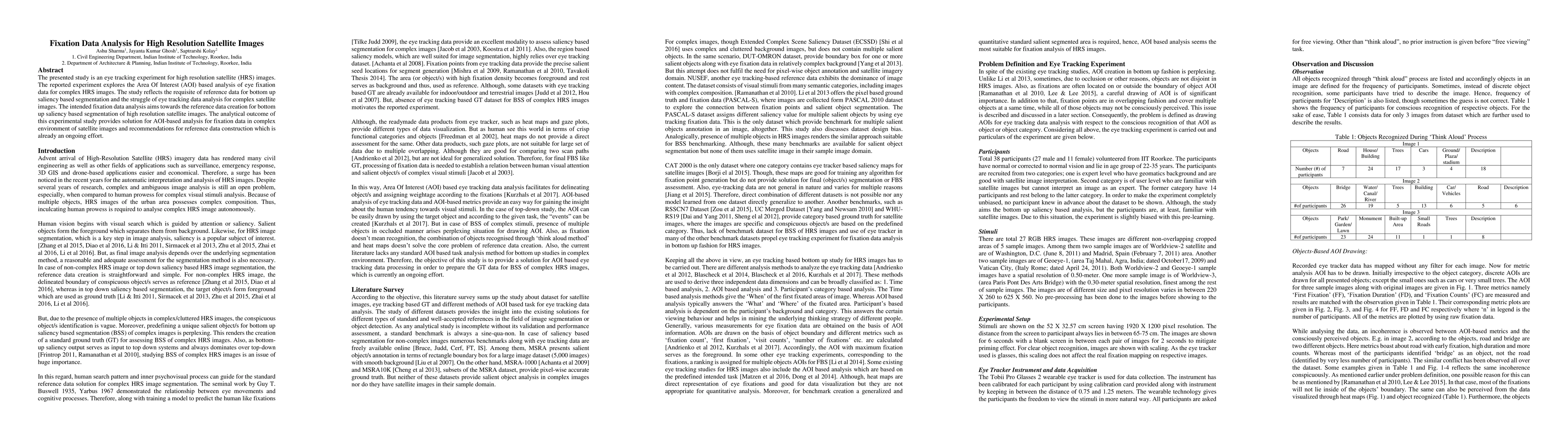 The presented study is an eye tracking experiment for high-resolution satellite (HRS) images. The reported experiment explores the Area Of Interest (AOI) based analysis of eye fixation data for complex HRS images. The study reflects the requisite of reference data for bottom-up saliency-based segmentation and the struggle of eye tracking data analysis for complex satellite images. The intended fixation data analysis aims towards the reference data creation for bottom-up saliency-based segmentation of high-resolution satellite images. The analytical outcome of this experimental study provides a solution for AOI-based analysis for fixation data in the complex environment of satellite images and recommendations for reference data construction which is already an ongoing effort.