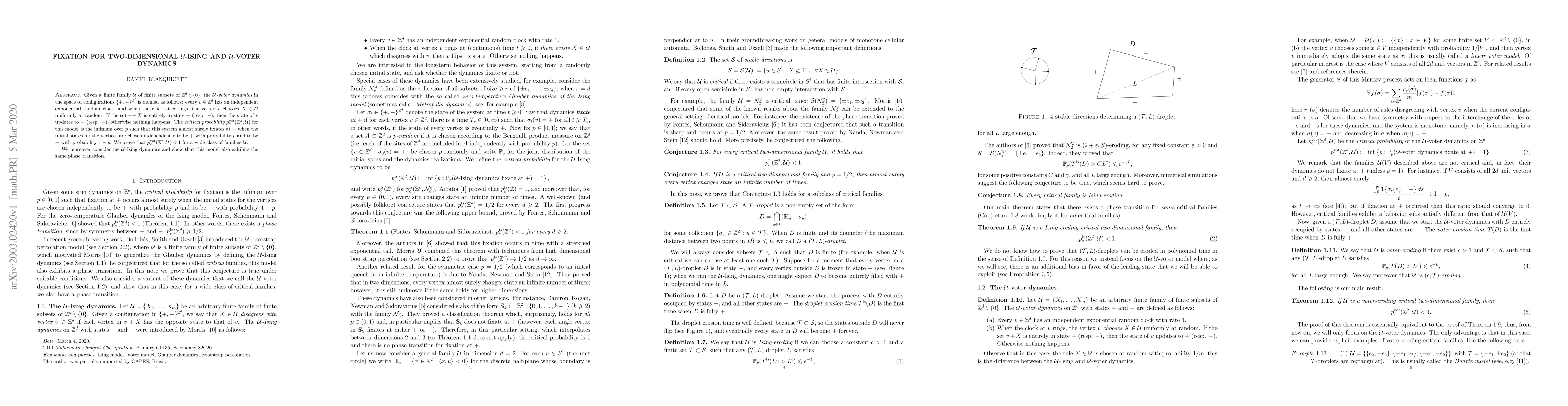 This paper investigates the critical probability for fixation in $\mathcal U$-voter dynamics and $\mathcal U$-Ising dynamics on $\mathbb Z^d$. It proves that the critical probability for the voter dynamics is less than 1 for a broad class of families $\mathcal U$, and it similarly demonstrates a phase transition for the $\mathcal U$-Ising dynamics.