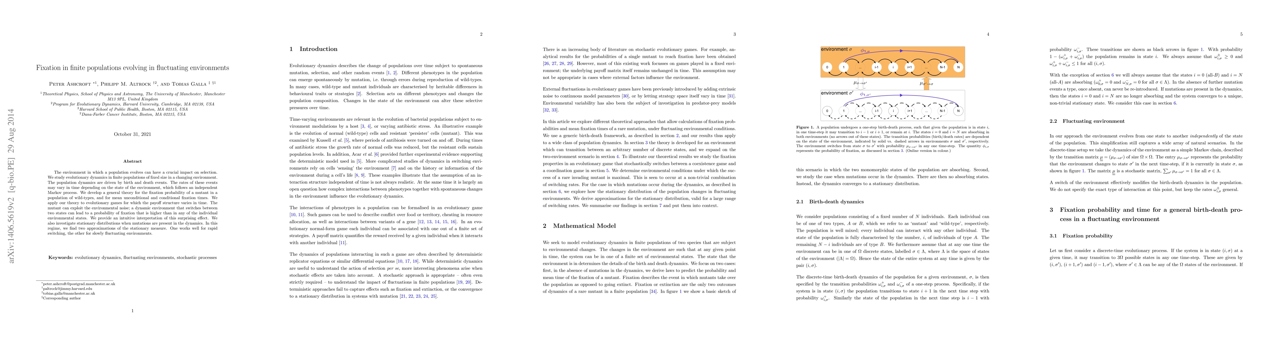 This paper develops a theory for evolutionary dynamics in finite populations, focusing on fixation probabilities and times for mutants in fluctuating environments. It reveals that environmental noise can enhance fixation probabilities, providing intuitive explanations and approximations for stationary distributions under different environmental fluctuation rates.