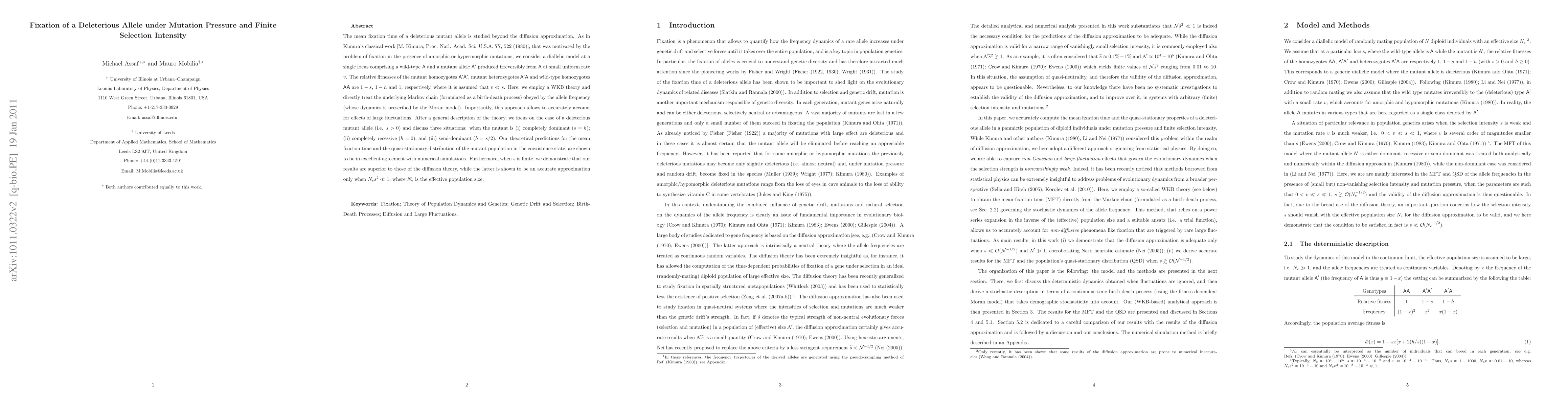 This paper studies the mean fixation time of a deleterious allele under mutation pressure and finite selection intensity, using a Markov chain approach beyond the diffusion approximation. It compares theoretical predictions with numerical simulations for three dominance scenarios, showing superior results compared to diffusion theory when effective population size times selection coefficient squared is not negligible.