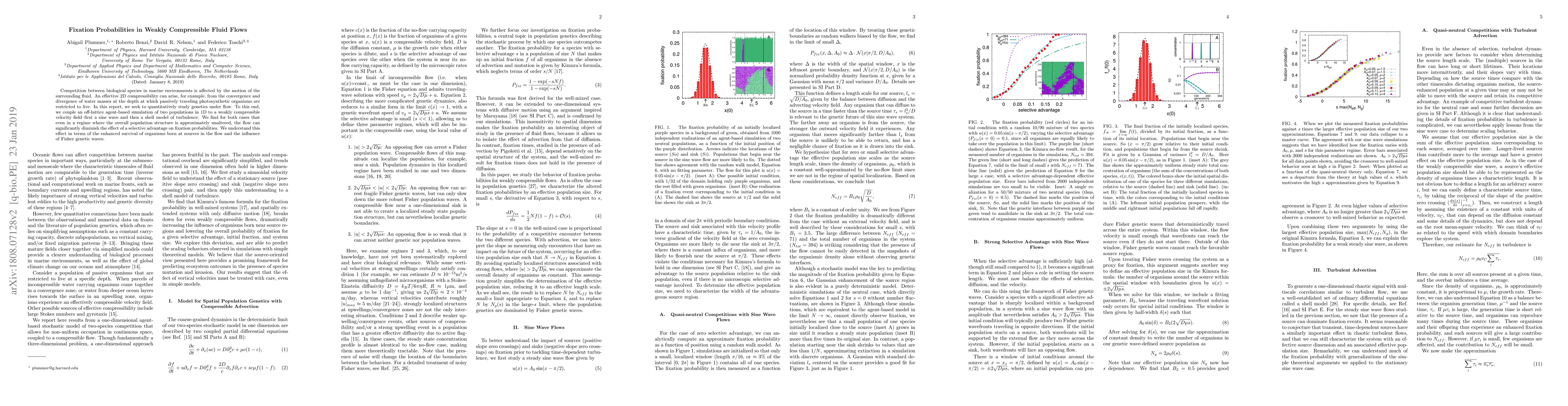 Competition between biological species in marine environments is affected by the motion of the surrounding fluid. An effective 2D compressibility can arise, for example, from the convergence and divergence of water masses at the depth at which passively traveling photosynthetic organisms are restricted to live. In this report, we seek to quantitatively study genetics under flow. To this end, we couple an off-lattice agent-based simulation of two populations in 1D to a weakly compressible velocity field--first a sine wave and then a shell model of turbulence. We find for both cases that even in a regime where the overall population structure is approximately unaltered, the flow can significantly diminish the effect of a selective advantage on fixation probabilities. We understand this effect in terms of the enhanced survival of organisms born at sources in the flow and the influence of Fisher genetic waves.
