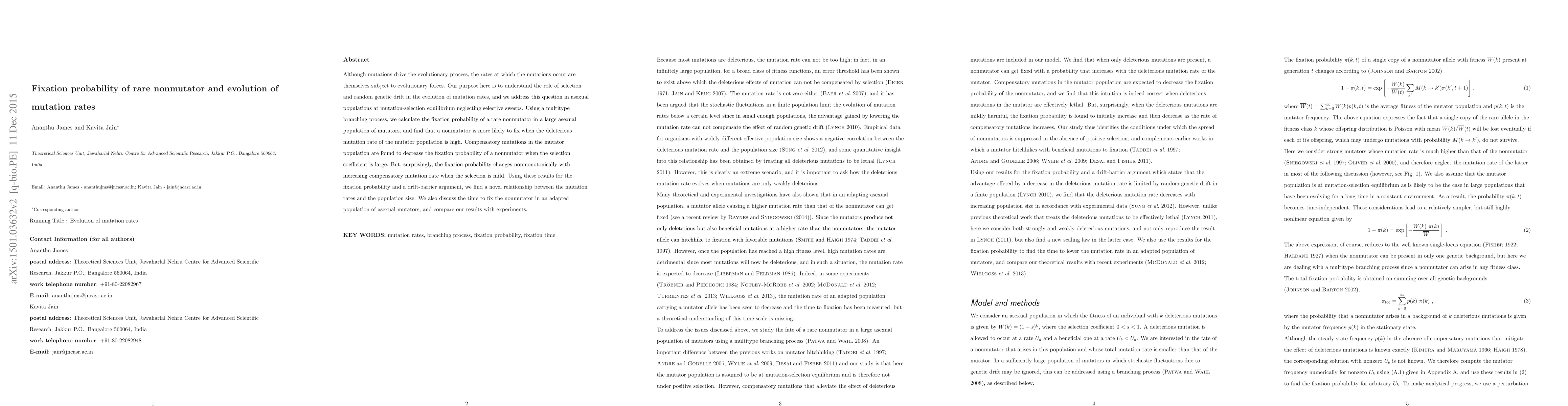 Although mutations drive the evolutionary process, the rates at which the mutations occur are themselves subject to evolutionary forces. Our purpose here is to understand the role of selection and random genetic drift in the evolution of mutation rates, and we address this question in asexual populations at mutation-selection equilibrium neglecting selective sweeps. Using a multitype branching process, we calculate the fixation probability of a rare nonmutator in a large asexual population of mutators, and find that a nonmutator is more likely to fix when the deleterious mutation rate of the mutator population is high. Compensatory mutations in the mutator population are found to decrease the fixation probability of a nonmutator when the selection coefficient is large. But, surprisingly, the fixation probability changes nonmonotonically with increasing compensatory mutation rate when the selection is mild. Using these results for the fixation probability and a drift-barrier argument, we find a novel relationship between the mutation rates and the population size. We also discuss the time to fix the nonmutator in an adapted population of asexual mutators, and compare our results with experiments.