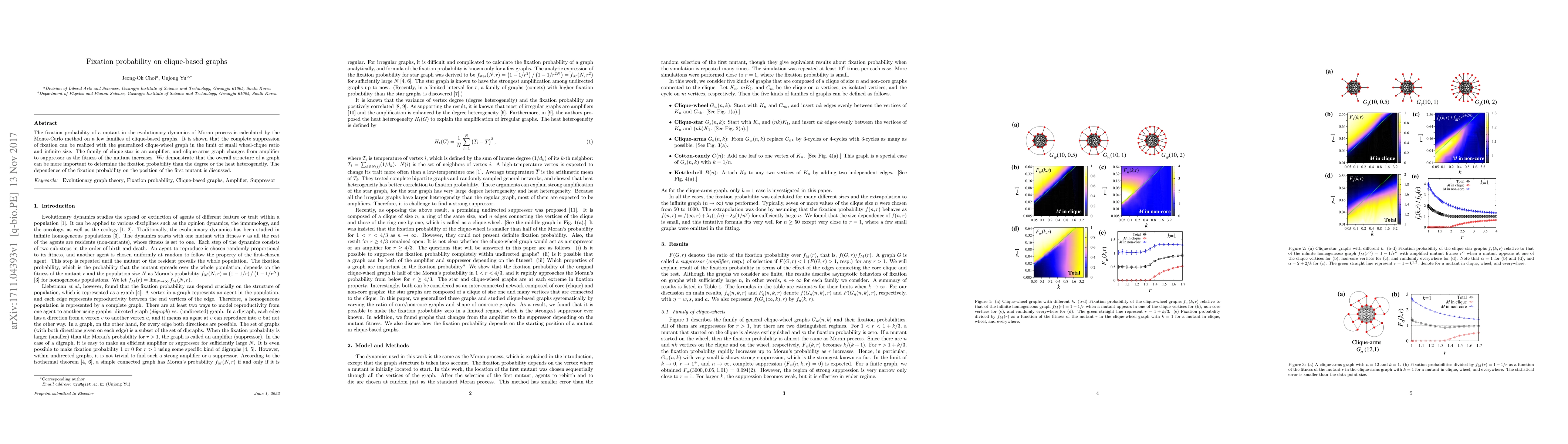 This paper investigates fixation probabilities in evolutionary dynamics on clique-based graphs using Monte-Carlo simulations. It finds that the generalized clique-wheel graph can completely suppress fixation under certain conditions, while clique-star amplifies fixation and clique-arms transition from amplifier to suppressor with increasing mutant fitness.