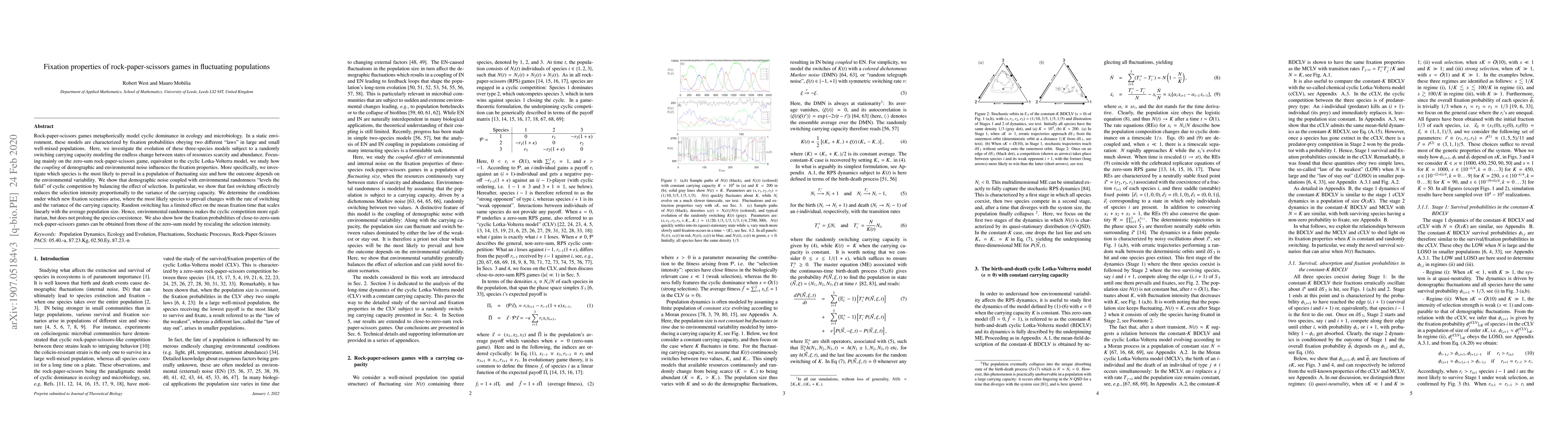 Rock-paper-scissors games metaphorically model cyclic dominance in ecology and microbiology. In a static environment, these models are characterized by fixation probabilities obeying two different "laws" in large and small well-mixed populations. Here, we investigate the evolution of these three-species models subject to a randomly switching carrying capacity modeling the endless change between states of resources scarcity and abundance. Focusing mainly on the zero-sum rock-paper-scissors game, equivalent to the cyclic Lotka-Volterra model, we study how the ${\it coupling}$ of demographic and environmental noise influences the fixation properties. More specifically, we investigate which species is the most likely to prevail in a population of fluctuating size and how the outcome depends on the environmental variability. We show that demographic noise coupled with environmental randomness "levels the field" of cyclic competition by balancing the effect of selection. In particular, we show that fast switching effectively reduces the selection intensity proportionally to the variance of the carrying capacity. We determine the conditions under which new fixation scenarios arise, where the most likely species to prevail changes with the rate of switching and the variance of the carrying capacity. Random switching has a limited effect on the mean fixation time that scales linearly with the average population size. Hence, environmental randomness makes the cyclic competition more egalitarian, but does not prolong the species coexistence. We also show how the fixation probabilities of close-to-zero-sum rock-paper-scissors games can be obtained from those of the zero-sum model by rescaling the selection intensity.