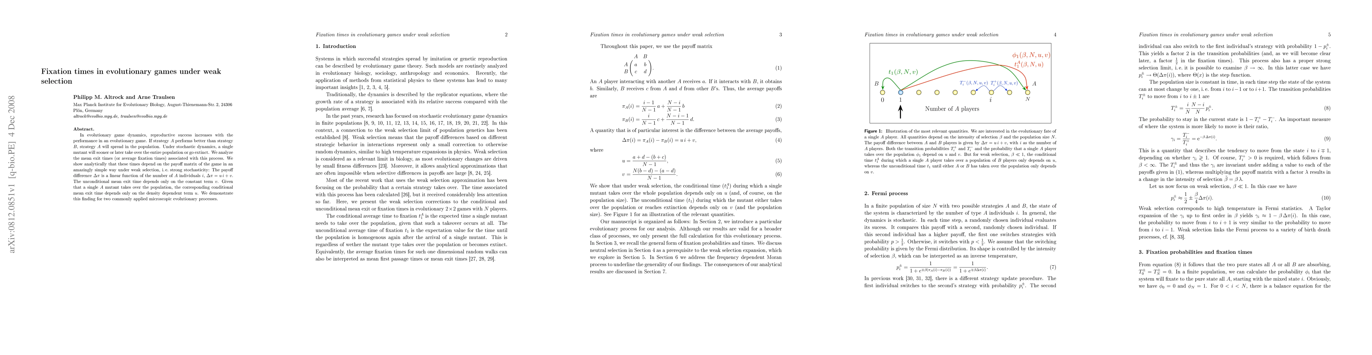 In evolutionary game dynamics, reproductive success increases with the performance in an evolutionary game. If strategy $A$ performs better than strategy $B$, strategy $A$ will spread in the population. Under stochastic dynamics, a single mutant will sooner or later take over the entire population or go extinct. We analyze the mean exit times (or average fixation times) associated with this process. We show analytically that these times depend on the payoff matrix of the game in an amazingly simple way under weak selection, ie strong stochasticity: The payoff difference $\Delta \pi$ is a linear function of the number of $A$ individuals $i$, $\Delta \pi = u i + v$. The unconditional mean exit time depends only on the constant term $v$. Given that a single $A$ mutant takes over the population, the corresponding conditional mean exit time depends only on the density dependent term $u$. We demonstrate this finding for two commonly applied microscopic evolutionary processes.