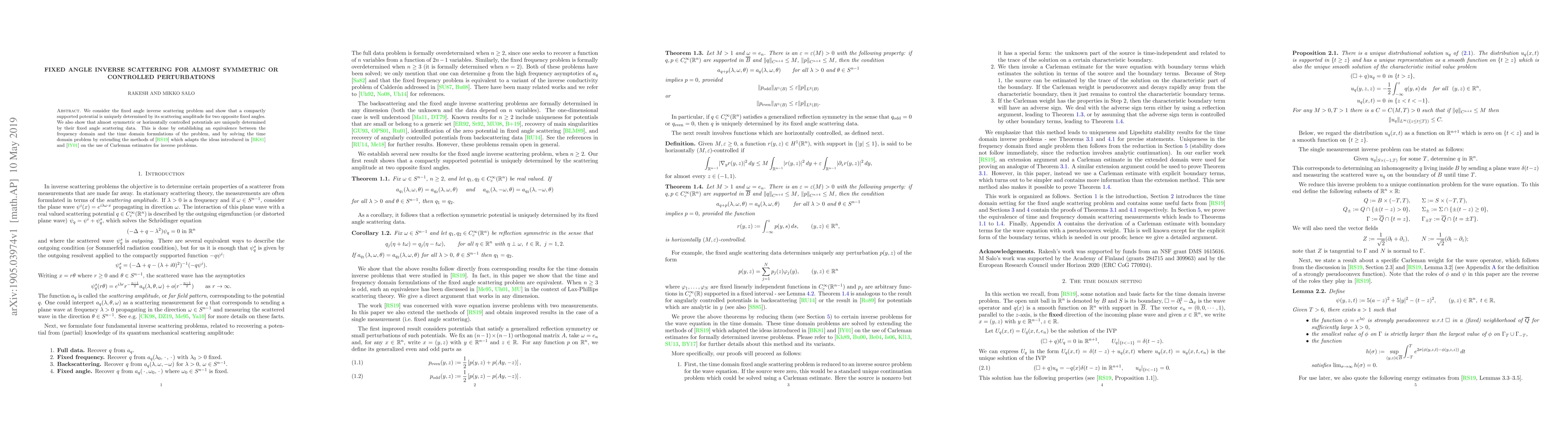 This paper addresses the fixed angle inverse scattering problem, demonstrating that compactly supported potentials can be uniquely identified by their scattering amplitudes at two fixed angles. It further extends this uniqueness to almost symmetric or horizontally controlled potentials, leveraging equivalence between frequency and time domain formulations and advanced methods from Carleman estimates.