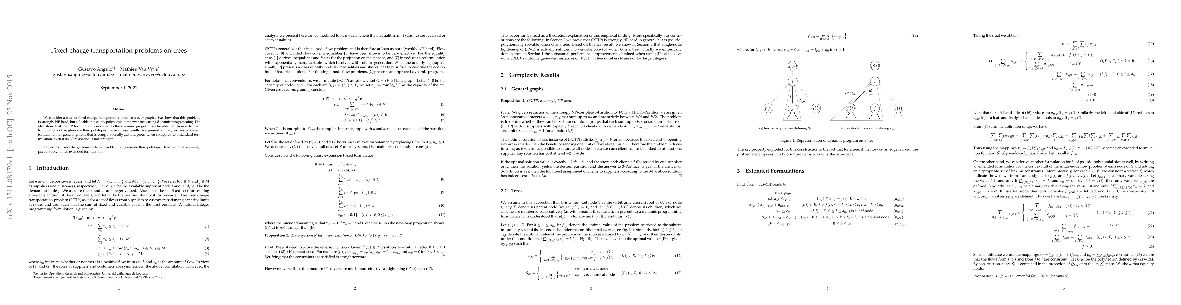 This paper addresses fixed-charge transportation problems on graphs, proving strong NP-hardness but solvable via dynamic programming on trees. It also presents a pseudo-polynomial time solution and compares its LP formulation to extended formulations of single-node flow polytopes, introducing a computationally efficient unary expansion-based formulation for general graphs.
