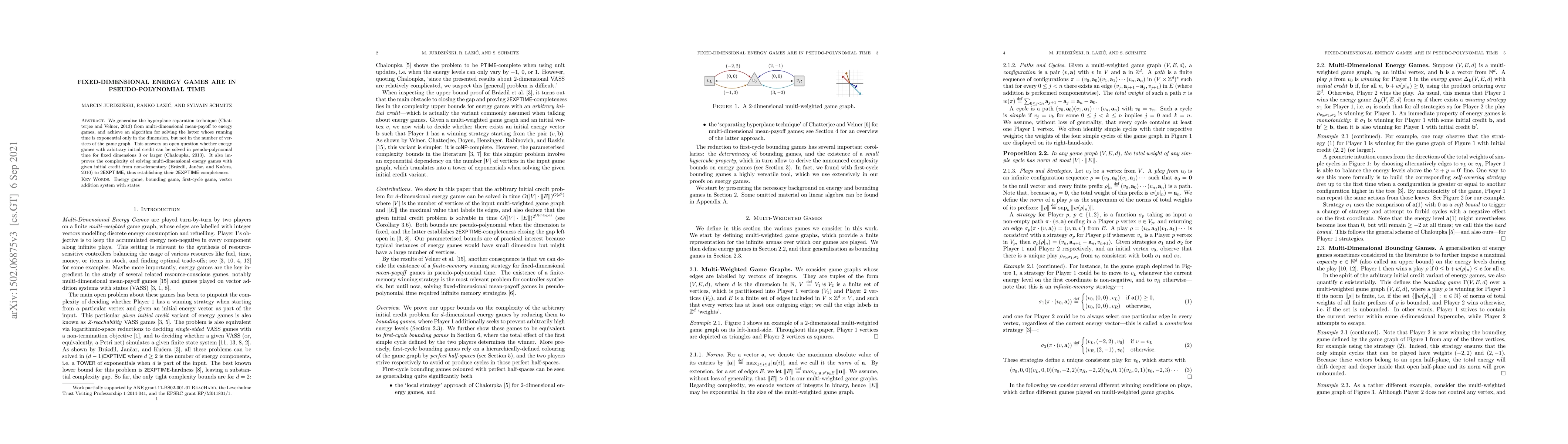 This paper presents an algorithm solving fixed-dimensional energy games in pseudo-polynomial time, improving upon previous non-elementary complexity results. The method generalizes hyperplane separation techniques to energy games, resolving the open question for dimensions 3 or larger.
