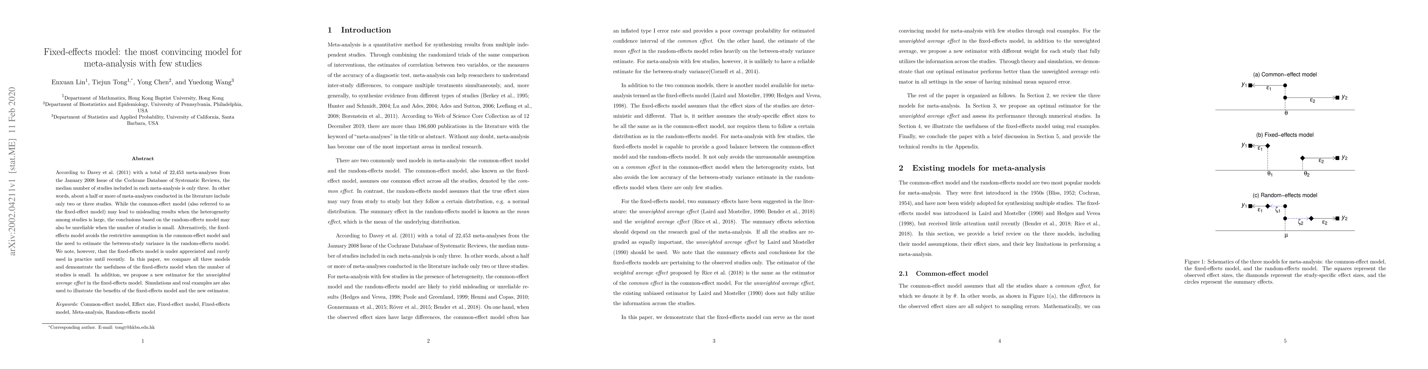 According to Davey et al. (2011) with a total of 22,453 meta-analyses from the January 2008 Issue of the Cochrane Database of Systematic Reviews, the median number of studies included in each meta-analysis is only three. In other words, about a half or more of meta-analyses conducted in the literature include only two or three studies. While the common-effect model (also referred to as the fixed-effect model) may lead to misleading results when the heterogeneity among studies is large, the conclusions based on the random-effects model may also be unreliable when the number of studies is small. Alternatively, the fixed-effects model avoids the restrictive assumption in the common-effect model and the need to estimate the between-study variance in the random-effects model. We note, however, that the fixed-effects model is under appreciated and rarely used in practice until recently. In this paper, we compare all three models and demonstrate the usefulness of the fixed-effects model when the number of studies is small. In addition, we propose a new estimator for the unweighted average effect in the fixed-effects model. Simulations and real examples are also used to illustrate the benefits of the fixed-effects model and the new estimator.