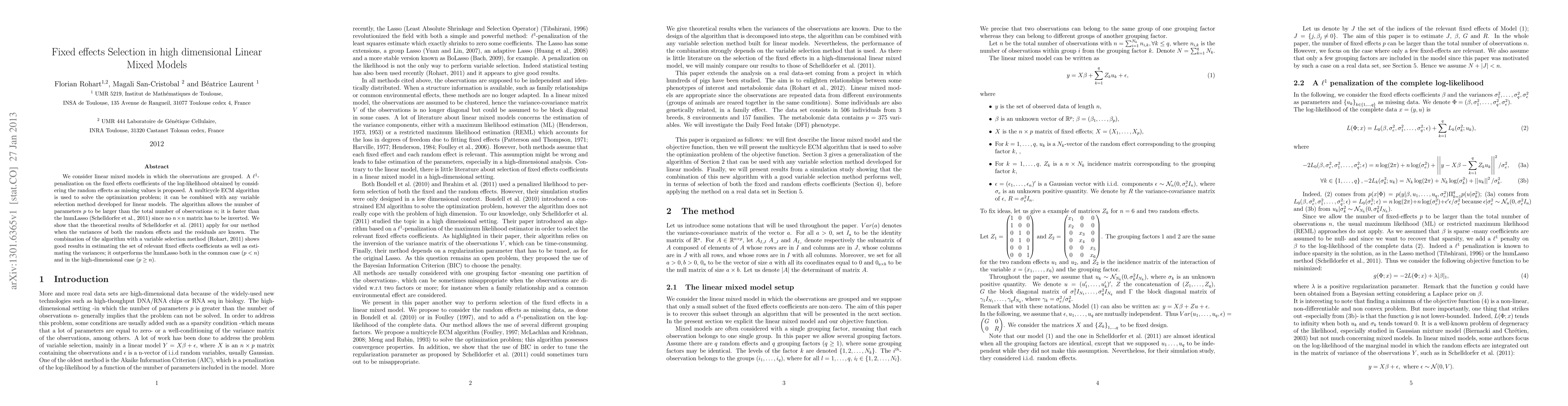 We consider linear mixed models in which the observations are grouped. A L1-penalization on the fixed effects coefficients of the log-likelihood obtained by considering the random effects as missing values is proposed. A multicycle ECM algorithm is used to solve the optimization problem; it can be combined with any variable selection method developed for linear models. The algorithm allows the number of parameters p to be larger than the total number of observations n; it is faster than the lmmLasso (Schelldorfer,2011) since no n*n matrix has to be inverted. We show that the theoretical results of Schelldorfer (2011) apply for our method when the variances of both the random effects and the residuals are known. The combination of the algorithm with a variable selection method (Rohart 2011) shows good results in estimating the set of relevant fixed effects coefficients as well as estimating the variances; it outperforms the lmmLasso both in the common case (p< n) and in the high-dimensional case (p > n).