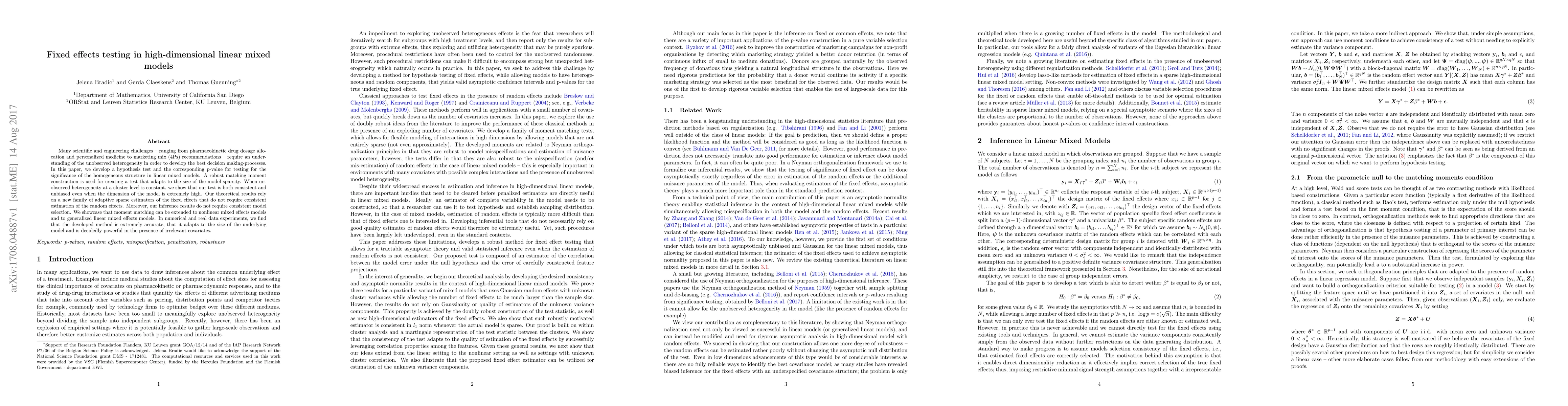 Many scientific and engineering challenges -- ranging from pharmacokinetic drug dosage allocation and personalized medicine to marketing mix (4Ps) recommendations -- require an understanding of the unobserved heterogeneity in order to develop the best decision making-processes. In this paper, we develop a hypothesis test and the corresponding p-value for testing for the significance of the homogeneous structure in linear mixed models. A robust matching moment construction is used for creating a test that adapts to the size of the model sparsity. When unobserved heterogeneity at a cluster level is constant, we show that our test is both consistent and unbiased even when the dimension of the model is extremely high. Our theoretical results rely on a new family of adaptive sparse estimators of the fixed effects that do not require consistent estimation of the random effects. Moreover, our inference results do not require consistent model selection. We showcase that moment matching can be extended to nonlinear mixed effects models and to generalized linear mixed effects models. In numerical and real data experiments, we find that the developed method is extremely accurate, that it adapts to the size of the underlying model and is decidedly powerful in the presence of irrelevant covariates.