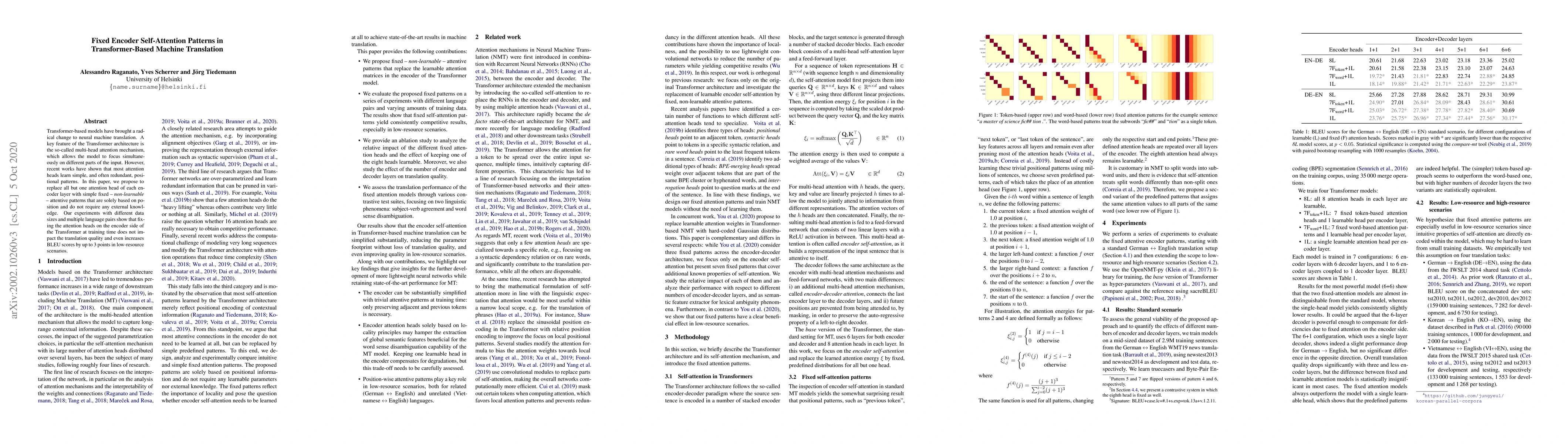 This paper proposes replacing most attention heads in Transformer-based machine translation models with fixed, non-learnable positional patterns, finding that this approach maintains translation quality without impacting BLEU scores and can improve them by up to 3 points in low-resource scenarios.