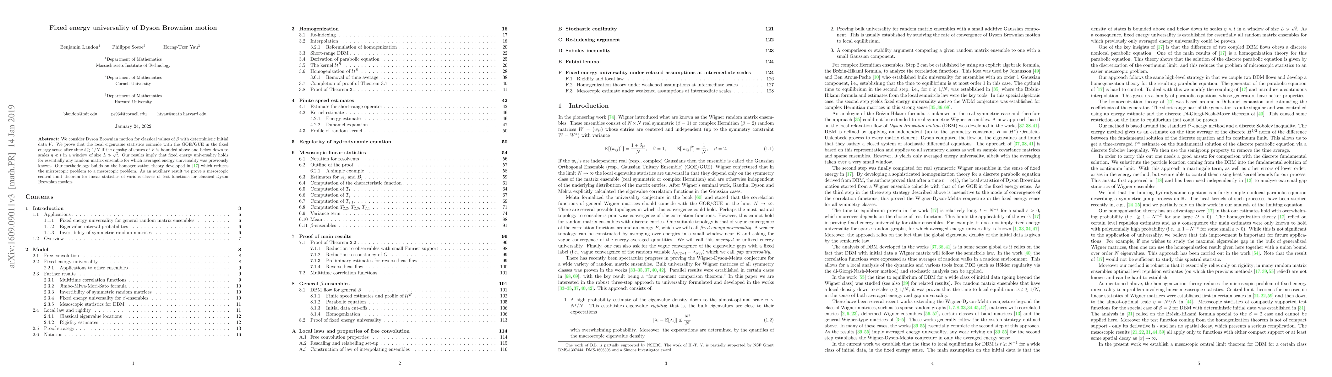 This paper proves fixed energy universality for Dyson Brownian motion, showing that local eigenvalue statistics converge to GOE/GUE after time $t \gtrsim 1/N$ under certain conditions on the initial data. The methodology leverages homogenization theory and includes a mesoscopic central limit theorem as an auxiliary result.