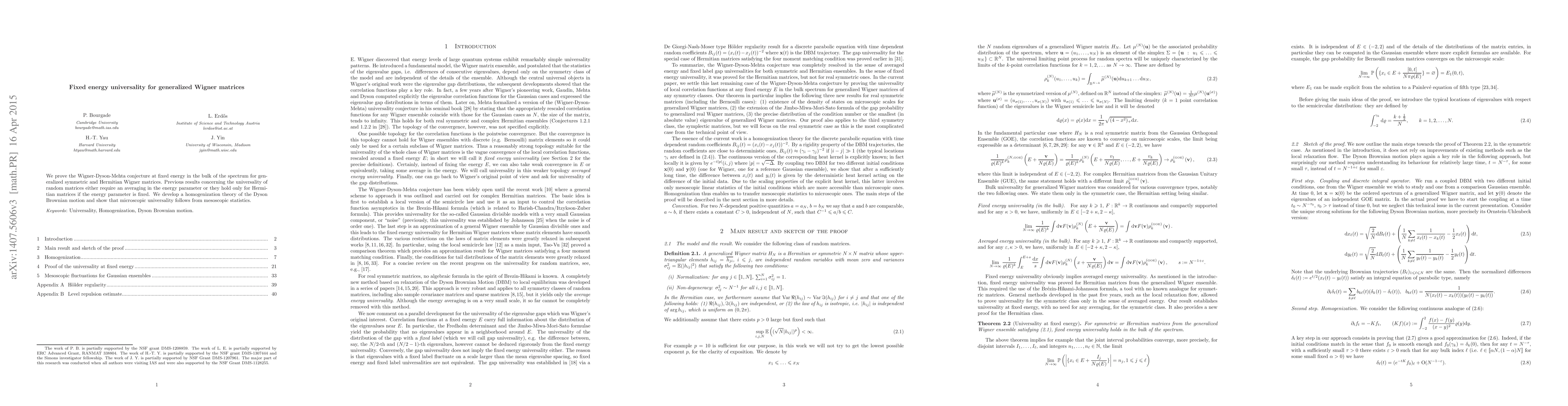 The paper proves the Wigner-Dyson-Mehta conjecture for generalized Wigner matrices at fixed energy, demonstrating that microscopic universality can emerge from mesoscopic statistics without averaging over the energy parameter, extending previous results that either averaged over energy or applied only to Hermitian matrices.