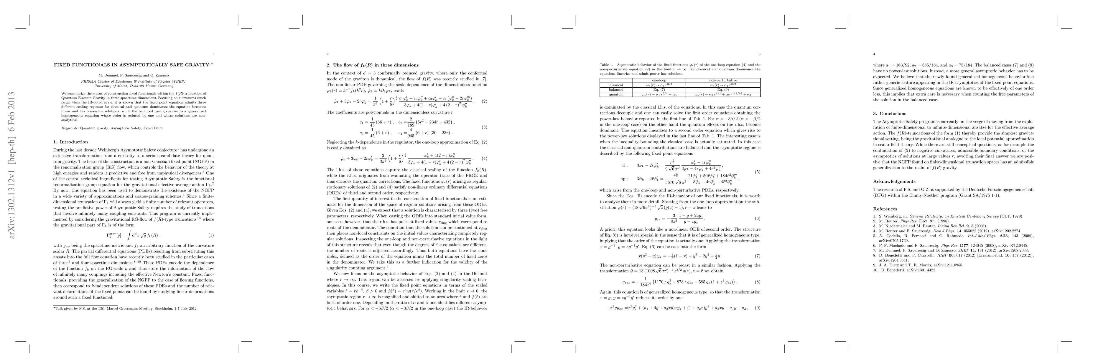 We summarize the status of constructing fixed functionals within the f(R)-truncation of Quantum Einstein Gravity in three spacetime dimensions. Focusing on curvatures much larger than the IR-cutoff scale, it is shown that the fixed point equation admits three different scaling regimes: for classical and quantum dominance the equation becomes linear and has power-law solutions, while the balanced case gives rise to a generalized homogeneous equation whose order is reduced by one and whose solutions are non-analytical.