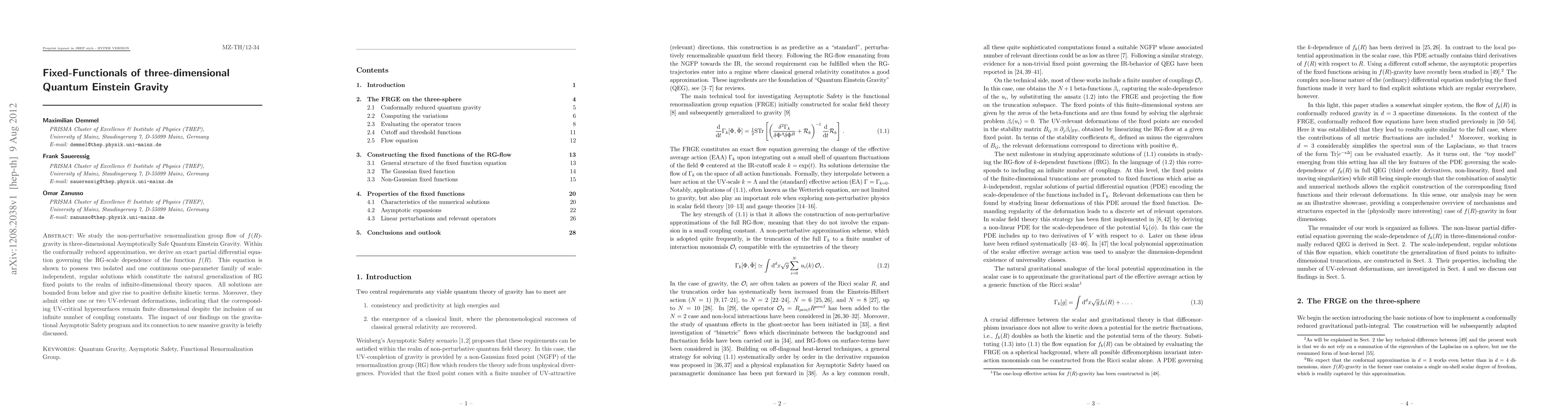 This paper investigates the non-perturbative renormalization group flow in three-dimensional Quantum Einstein Gravity, revealing exact solutions for the function f(R) that generalize RG fixed points. These solutions indicate finite-dimensional UV-critical hypersurfaces and have implications for the gravitational Asymptotic Safety program and its relation to new massive gravity.