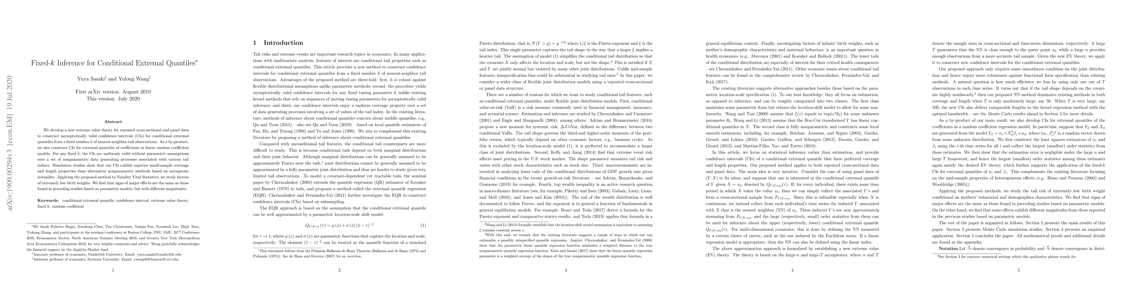 We develop a new extreme value theory for repeated cross-sectional and panel data to construct asymptotically valid confidence intervals (CIs) for conditional extremal quantiles from a fixed number $k$ of nearest-neighbor tail observations. As a by-product, we also construct CIs for extremal quantiles of coefficients in linear random coefficient models. For any fixed $k$, the CIs are uniformly valid without parametric assumptions over a set of nonparametric data generating processes associated with various tail indices. Simulation studies show that our CIs exhibit superior small-sample coverage and length properties than alternative nonparametric methods based on asymptotic normality. Applying the proposed method to Natality Vital Statistics, we study factors of extremely low birth weights. We find that signs of major effects are the same as those found in preceding studies based on parametric models, but with different magnitudes.