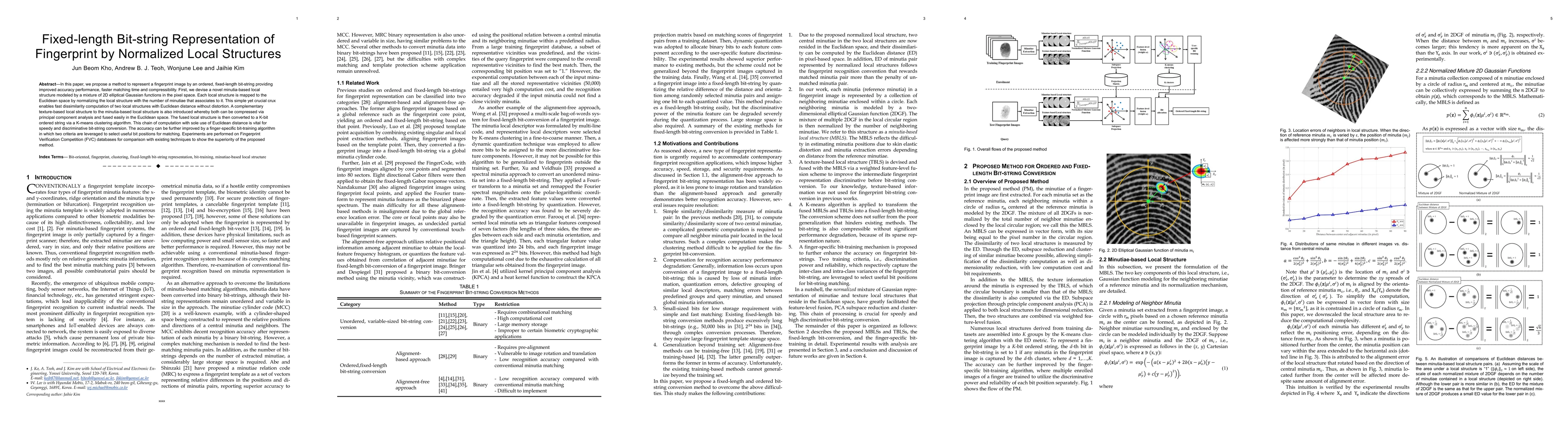 This paper proposes a novel method for representing fingerprint images as a fixed-length bit-string using normalized local structures, which enhances accuracy and matching speed. The method combines minutia-based and texture-based local structures, compresses them via PCA, and converts them into a bit-string using K-means clustering for fast and effective fingerprint recognition.
