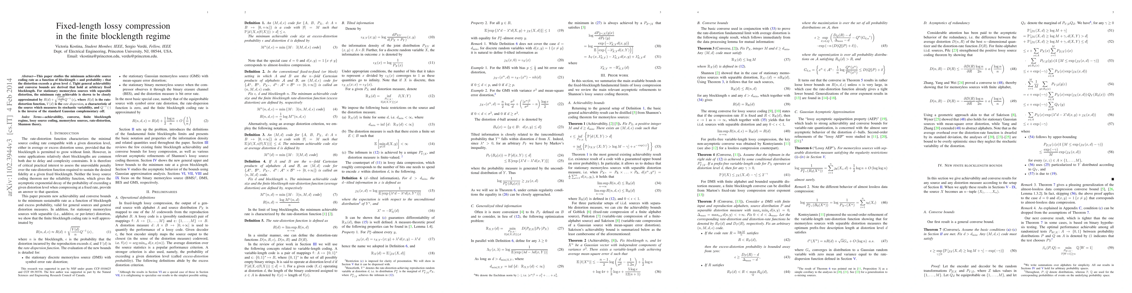 This paper studies the minimum achievable source coding rate as a function of blocklength $n$ and probability $\epsilon$ that the distortion exceeds a given level $d$. Tight general achievability and converse bounds are derived that hold at arbitrary fixed blocklength. For stationary memoryless sources with separable distortion, the minimum rate achievable is shown to be closely approximated by $R(d) + \sqrt{\frac{V(d)}{n}} Q^{-1}(\epsilon)$, where $R(d)$ is the rate-distortion function, $V(d)$ is the rate dispersion, a characteristic of the source which measures its stochastic variability, and $Q^{-1}(\epsilon)$ is the inverse of the standard Gaussian complementary cdf.