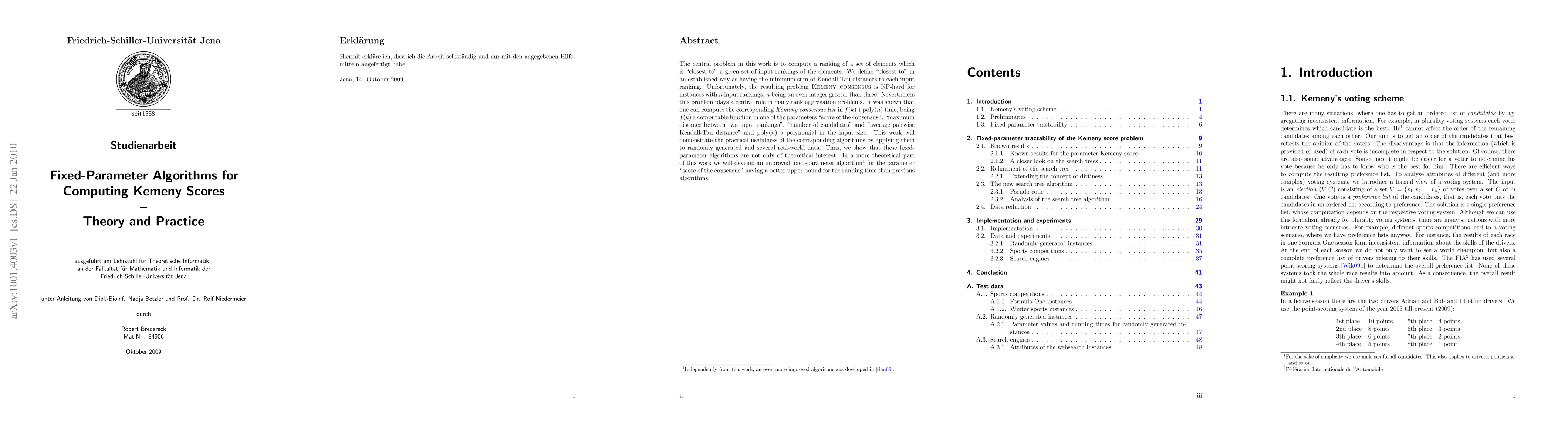 This paper explores fixed-parameter algorithms for computing Kemeny scores, addressing the NP-hard problem of finding the ranking closest to a set of input rankings. It presents practical applications of these algorithms on both random and real-world data, alongside an improved theoretical algorithm for the "score of the consensus" parameter.