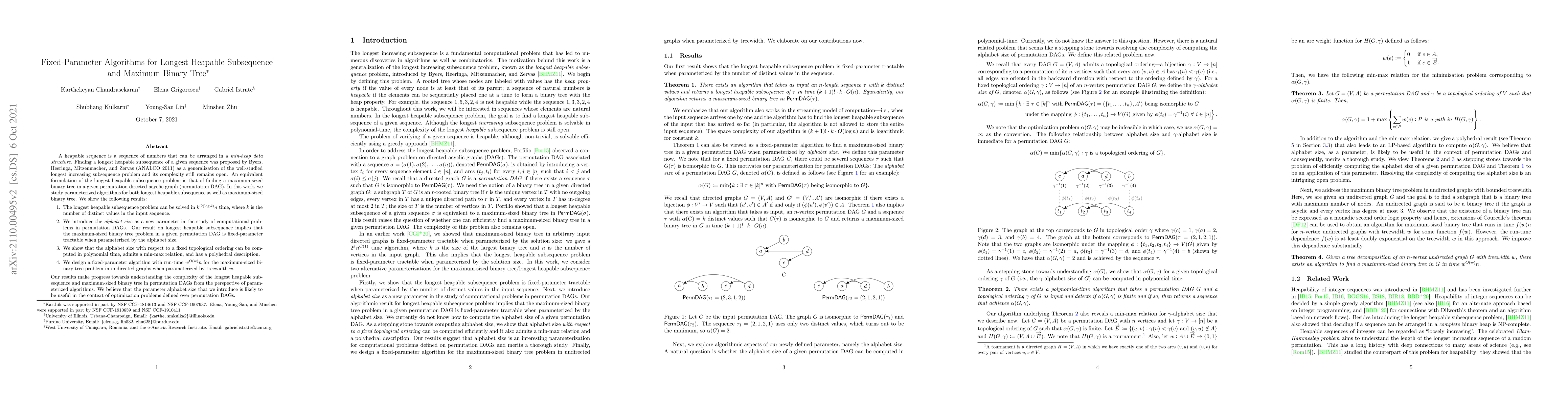 This paper develops fixed-parameter algorithms for finding the longest heapable subsequence and the maximum-sized binary tree in permutation DAGs. It achieves fixed-parameter tractability by introducing the "alphabet size" as a new parameter, achieving $k^{O(\log{k})}n$ time complexity for the former, where $k$ is the number of distinct values.