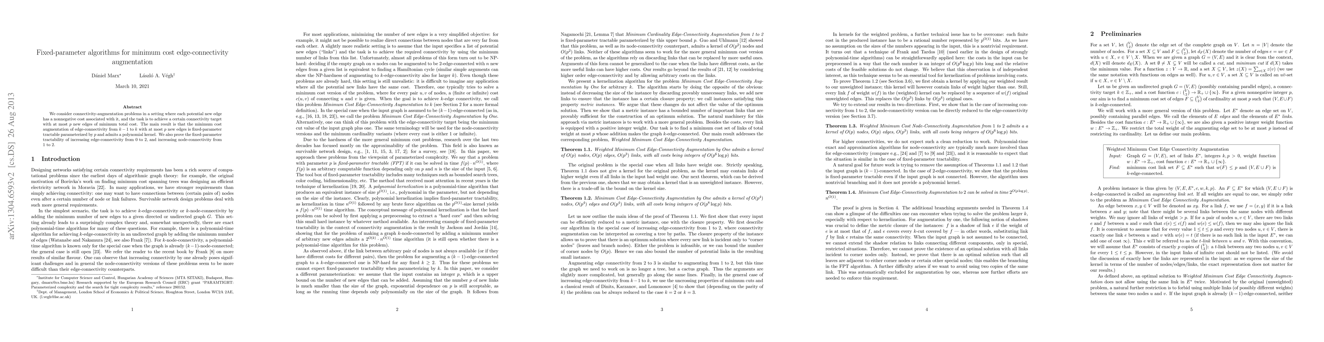 This paper explores fixed-parameter algorithms for minimum cost edge-connectivity augmentation, proving that achieving connectivity targets with a specified number of new edges is fixed-parameter tractable and admits a polynomial kernel. It also establishes the fixed-parameter tractability for increasing edge-connectivity from 0 to 2 and node-connectivity from 1 to 2.