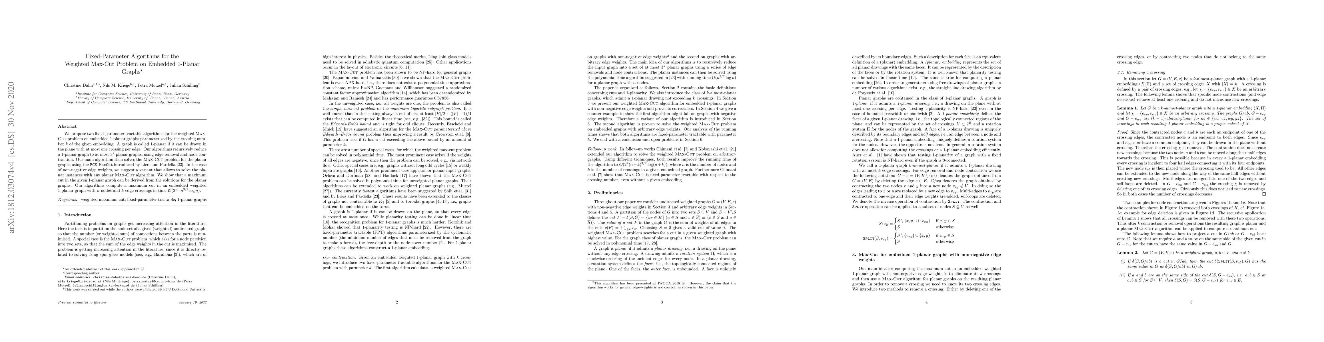 This paper proposes two fixed-parameter tractable algorithms for solving the weighted Max-Cut problem on embedded 1-planar graphs, parameterized by the crossing number $k$. The algorithms reduce the 1-planar graph to at most $3^k$ planar graphs and solve the Max-Cut problem using existing planar algorithms, achieving a runtime of $O(3^k \cdot n^{3/2} \log n)$.