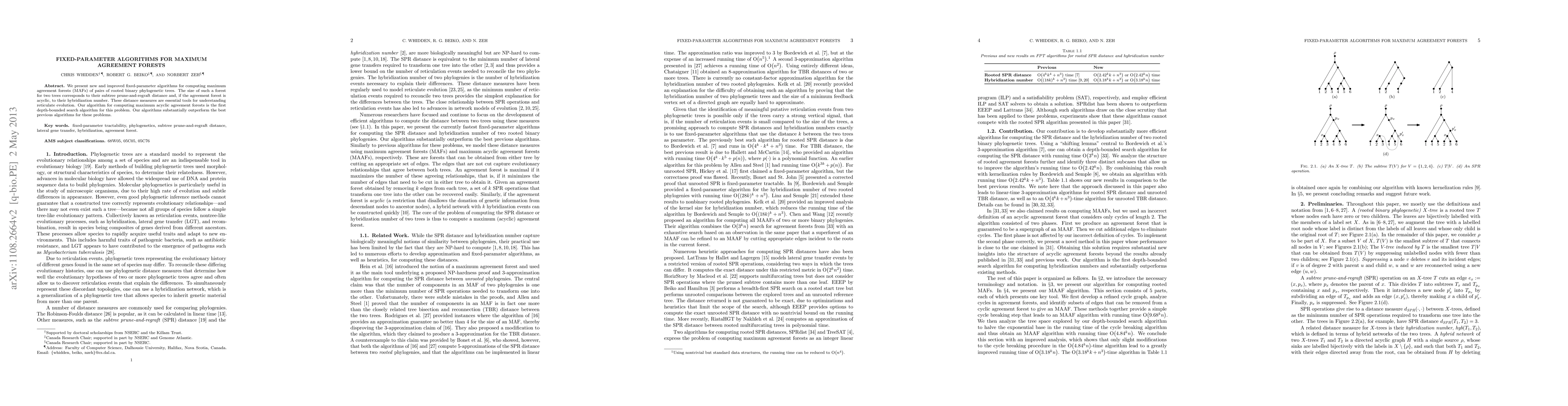 We present new and improved fixed-parameter algorithms for computing maximum agreement forests (MAFs) of pairs of rooted binary phylogenetic trees. The size of such a forest for two trees corresponds to their subtree prune-and-regraft distance and, if the agreement forest is acyclic, to their hybridization number. These distance measures are essential tools for understanding reticulate evolution. Our algorithm for computing maximum acyclic agreement forests is the first depth-bounded search algorithm for this problem. Our algorithms substantially outperform the best previous algorithms for these problems.