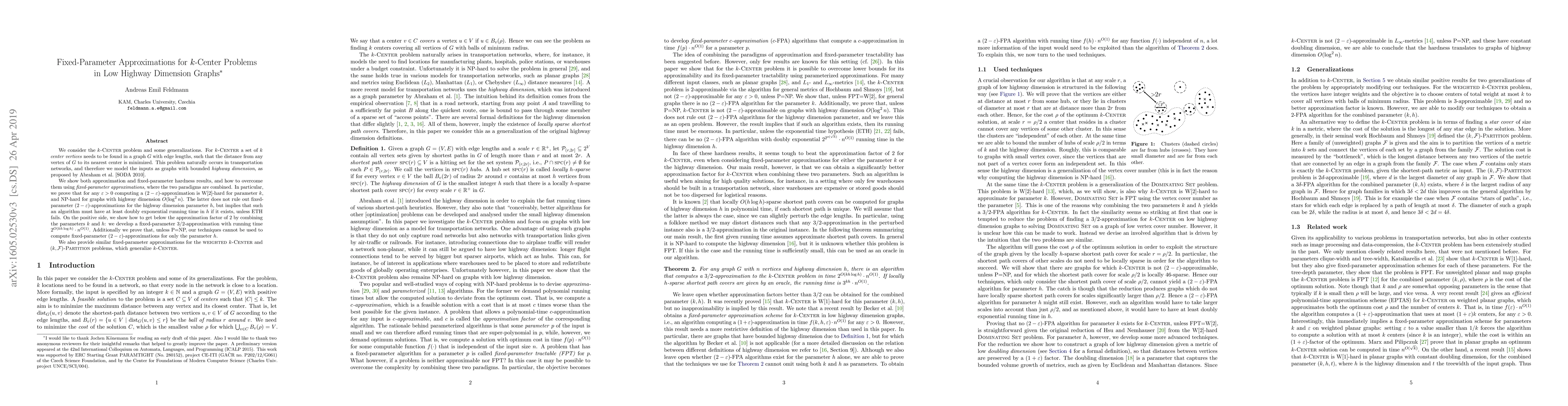 This paper investigates the $k$-Center problem in graphs with bounded highway dimension, demonstrating both approximation and fixed-parameter hardness results. It proves that achieving a $(2-\varepsilon)$-approximation is W[2]-hard and NP-hard for certain graph dimensions, but presents a fixed-parameter $3/2$-approximation algorithm combining $k$ and $h$ parameters.