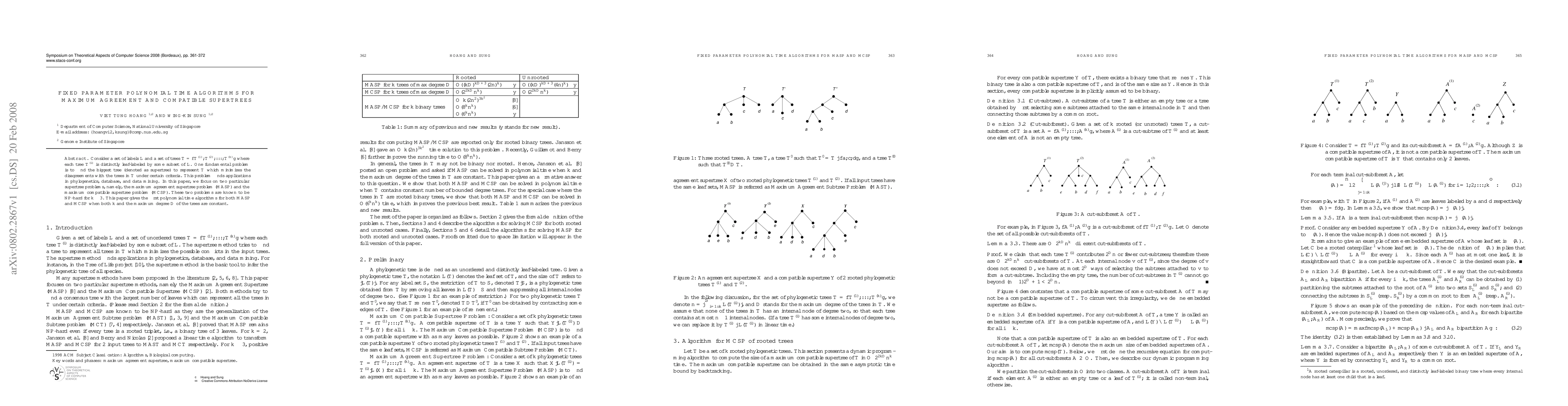 This paper presents the first fixed parameter polynomial time algorithms for the maximum agreement supertree problem (MASP) and the maximum compatible supertree problem (MCSP), addressing NP-hard challenges in phylogenetics and data mining when the number of input trees and their maximum degree are constants.